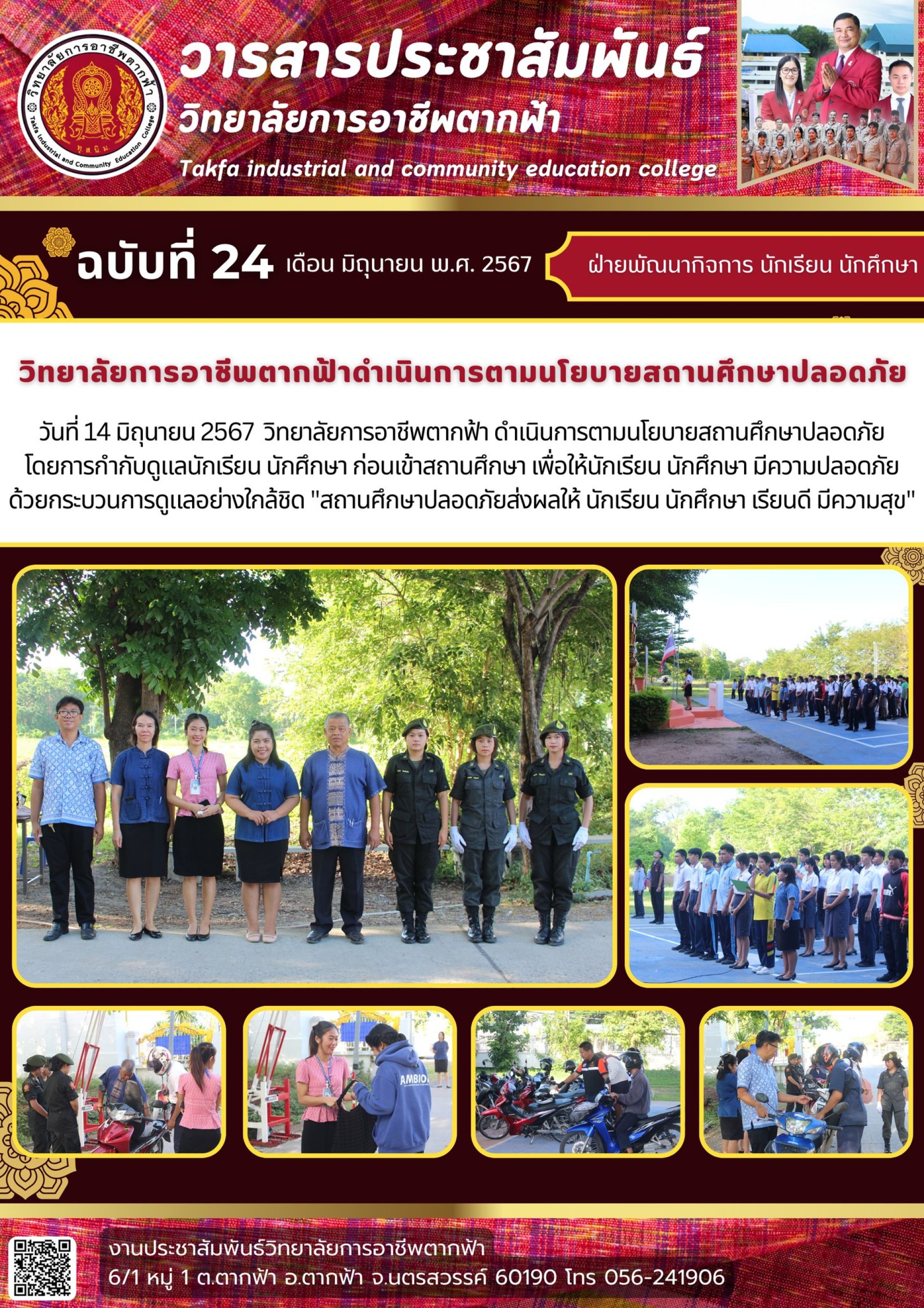 วารสารตากฟ้า ประจำเดือน มิถุนายน 2567 ฉบับที่ 24 วิทยาลัยการอาชีพตากฟ้าดำเนินการตามนโยบายสถานศึกษาปลอดภัย