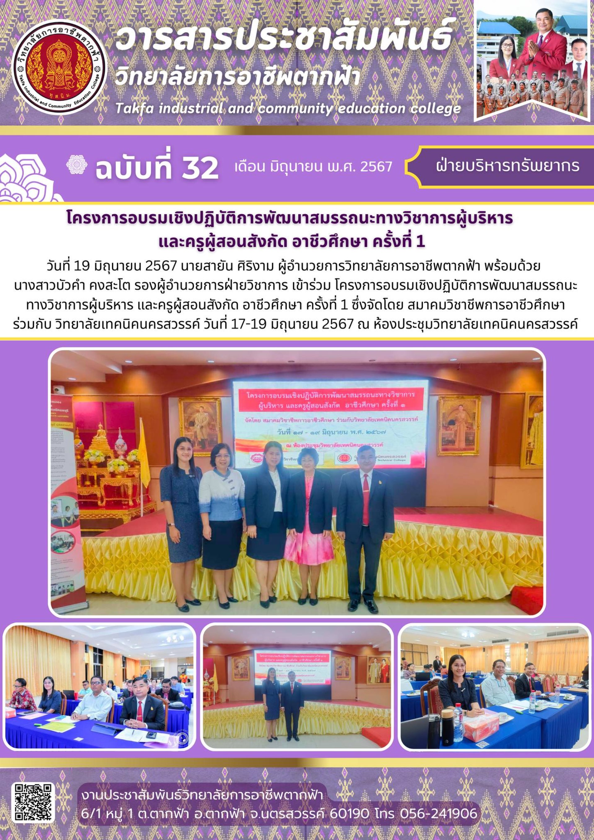 วารสารตากฟ้า ประจำเดือน มิถุนายน 2567 ฉบับที่ 32 โครงการอบรมเชิงปฏิบัติการพัฒนาสมรรถนะทางวิชาการผู้บริหาร และครูผู้สอนสังกัด อาชีวศึกษา ครั้งที่ 1