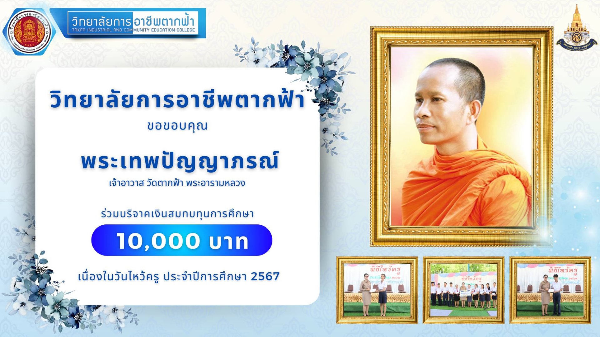 วิทยาลัยการอาชีพตากฟ้า ขอขอบคุณ ผู้ร่วมบริจาคเงินสมทบทุนการศึกษาเนื่องในวันไหว้ครู ประจำปีการศึกษา 2567