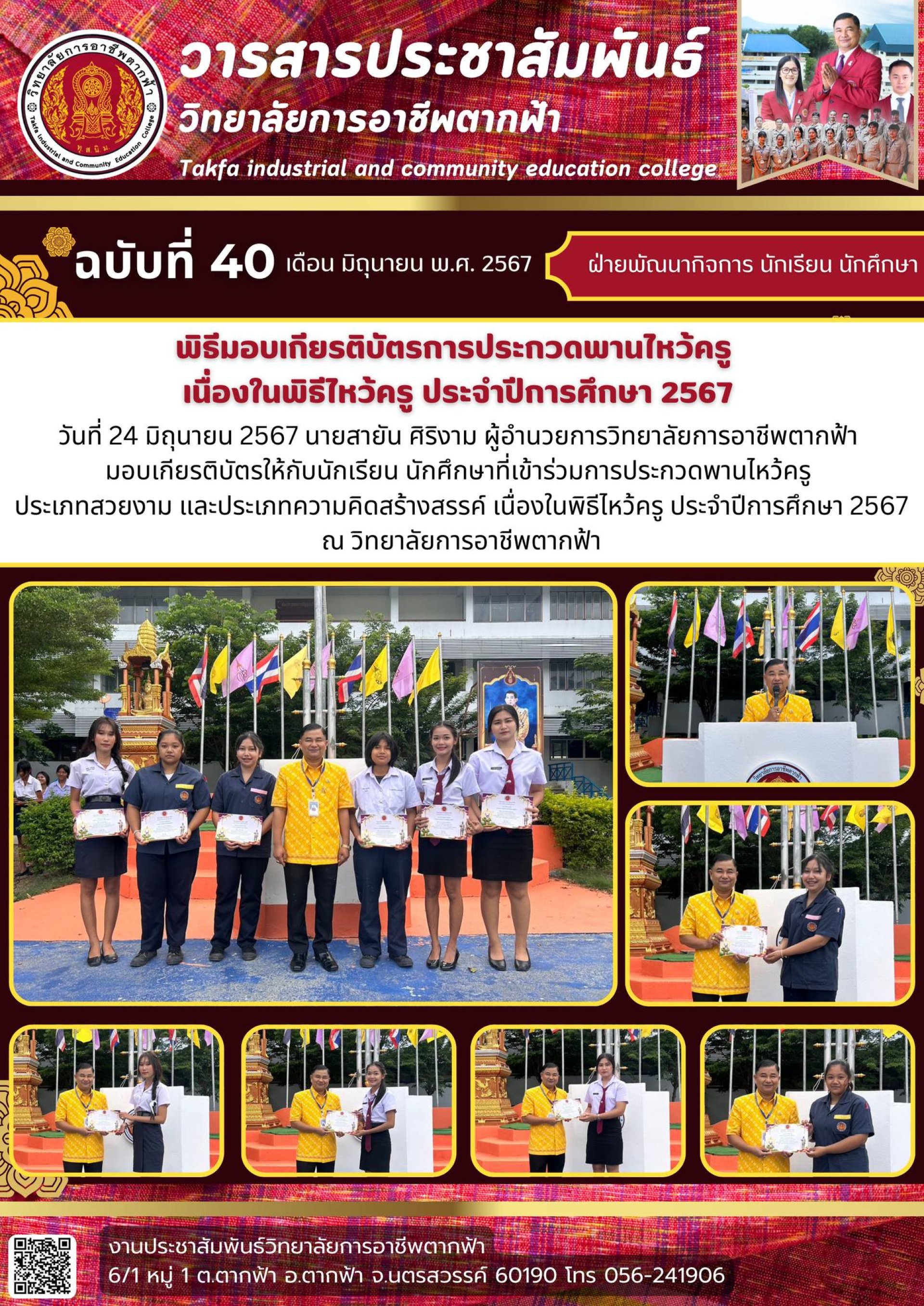 วารสารตากฟ้า ประจำเดือน มิถุนายน 2567 ฉบับที่ 40 พิธีมอบเกียรติบัตรการประกวดพานไหว้ครู เนื่องในพิธีไหว้ครู ประจำปีการศึกษา 2567