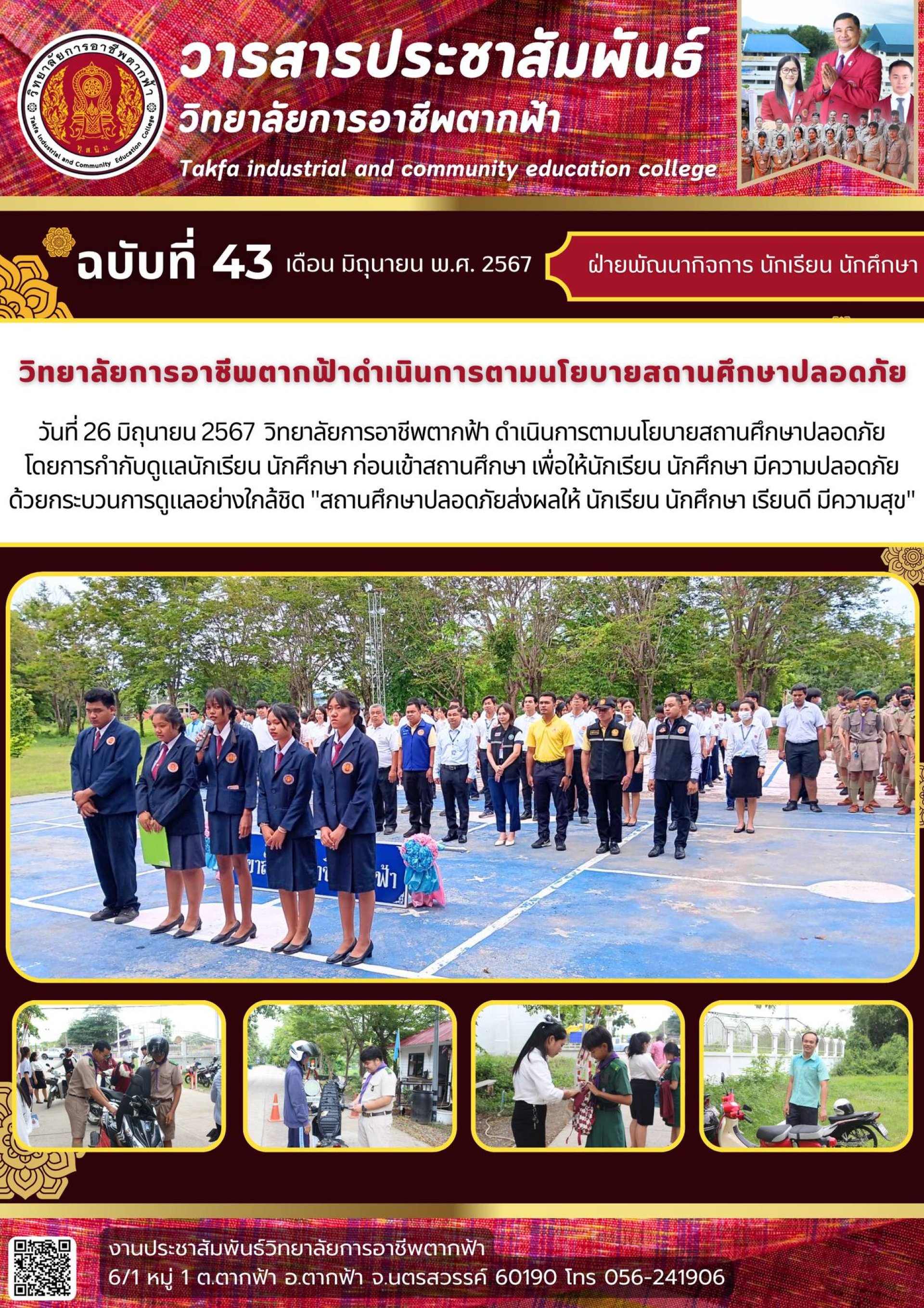 วารสารตากฟ้า ประจำเดือน มิถุนายน 2567 ฉบับที่ 43 วิทยาลัยการอาชีพตากฟ้าดำเนินการตามนโยบายสถานศึกษาปลอดภัย