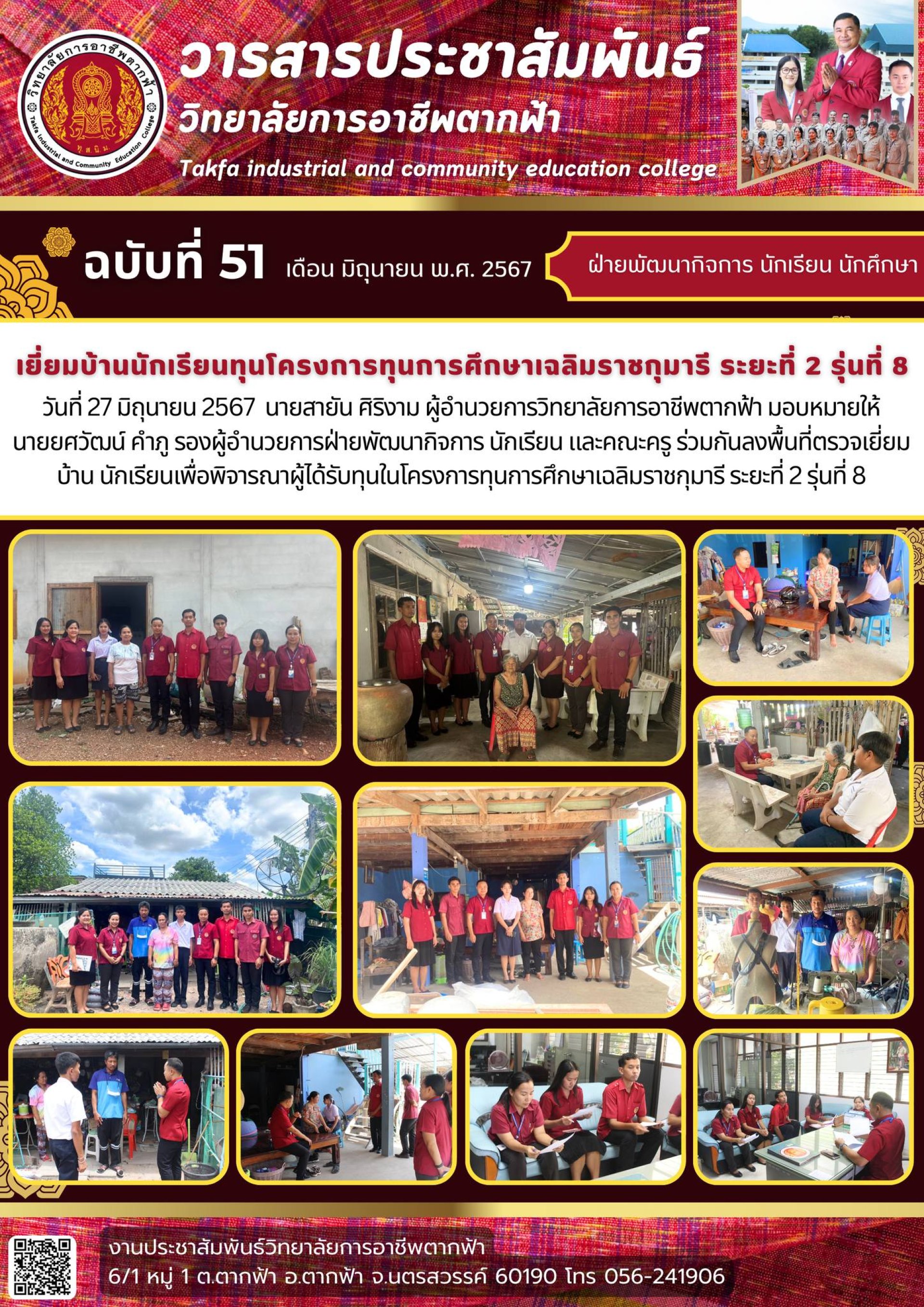 วารสารตากฟ้า ประจำเดือน มิถุนายน 2567 ฉบับที่ 51 เยี่ยมบ้านนักเรียนทุนโครงการทุนการศึกษาเฉลิมราชกุมารี ระยะที่ 2 รุ่นที่ 8