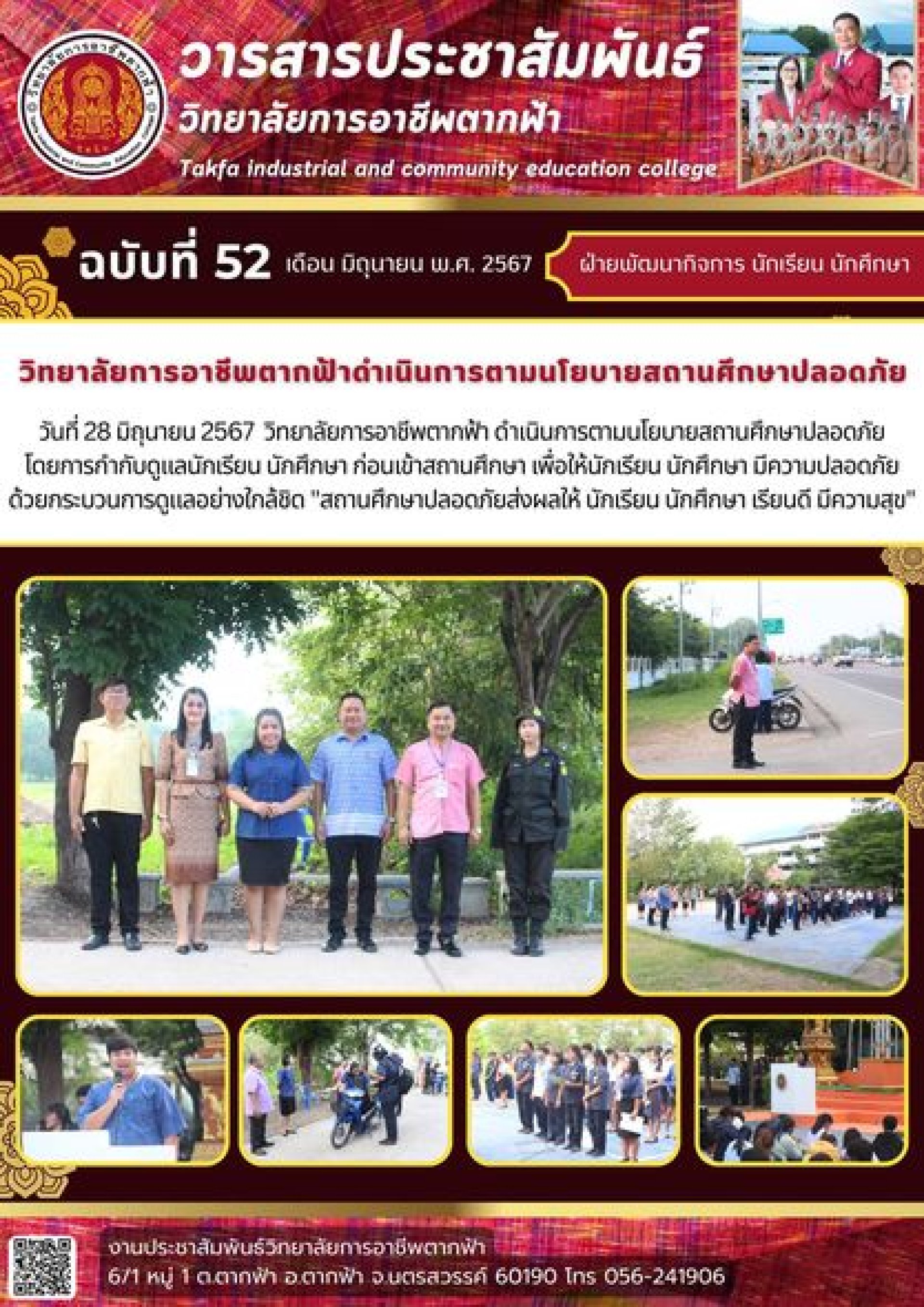 วารสารตากฟ้า ประจำเดือน มิถุนายน 2567 ฉบับที่ 52 วิทยาลัยการอาชีพตากฟ้าดำเนินการตามนโยบายสถานศึกษาปลอดภัย