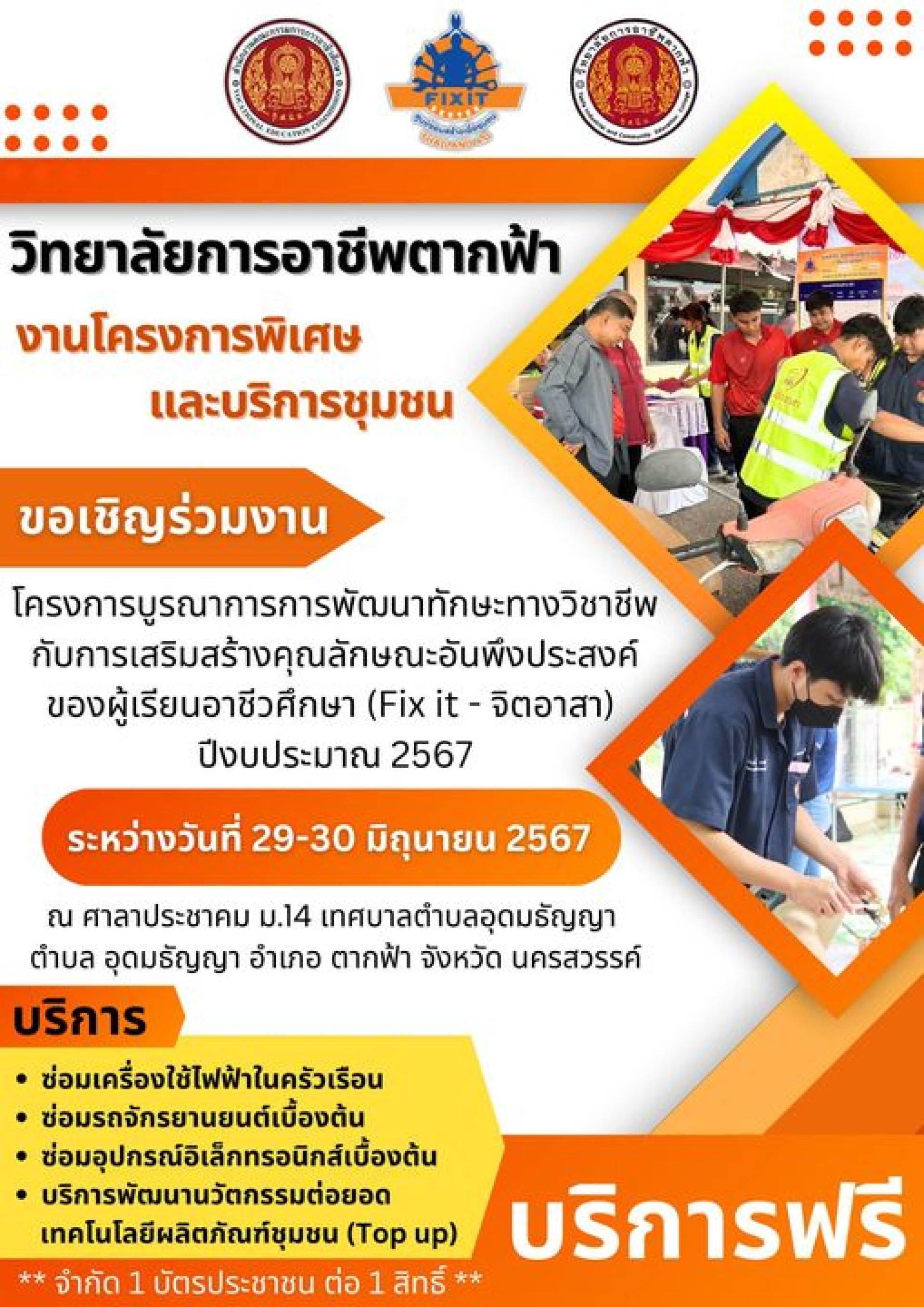ประกาศวิทยาลัยการอาชีพตากฟ้า งานโครงการพิเศษและบริการชุมชน ขอเชิญร่วมงานโครงการบูรณาการการพัฒนาทักษะทางวิชาชีพกับการเสริมสร้างคุณลักษณะอันพึงประสงค์ของผู้เรียนอาชีวศึกษา (Fix it - จิตอาสา) ปีงบประมาณ 2567 ระหว่างวันที่ 29-30 มิถุนายน 2567 ณ ศาลาประชาคม ม.