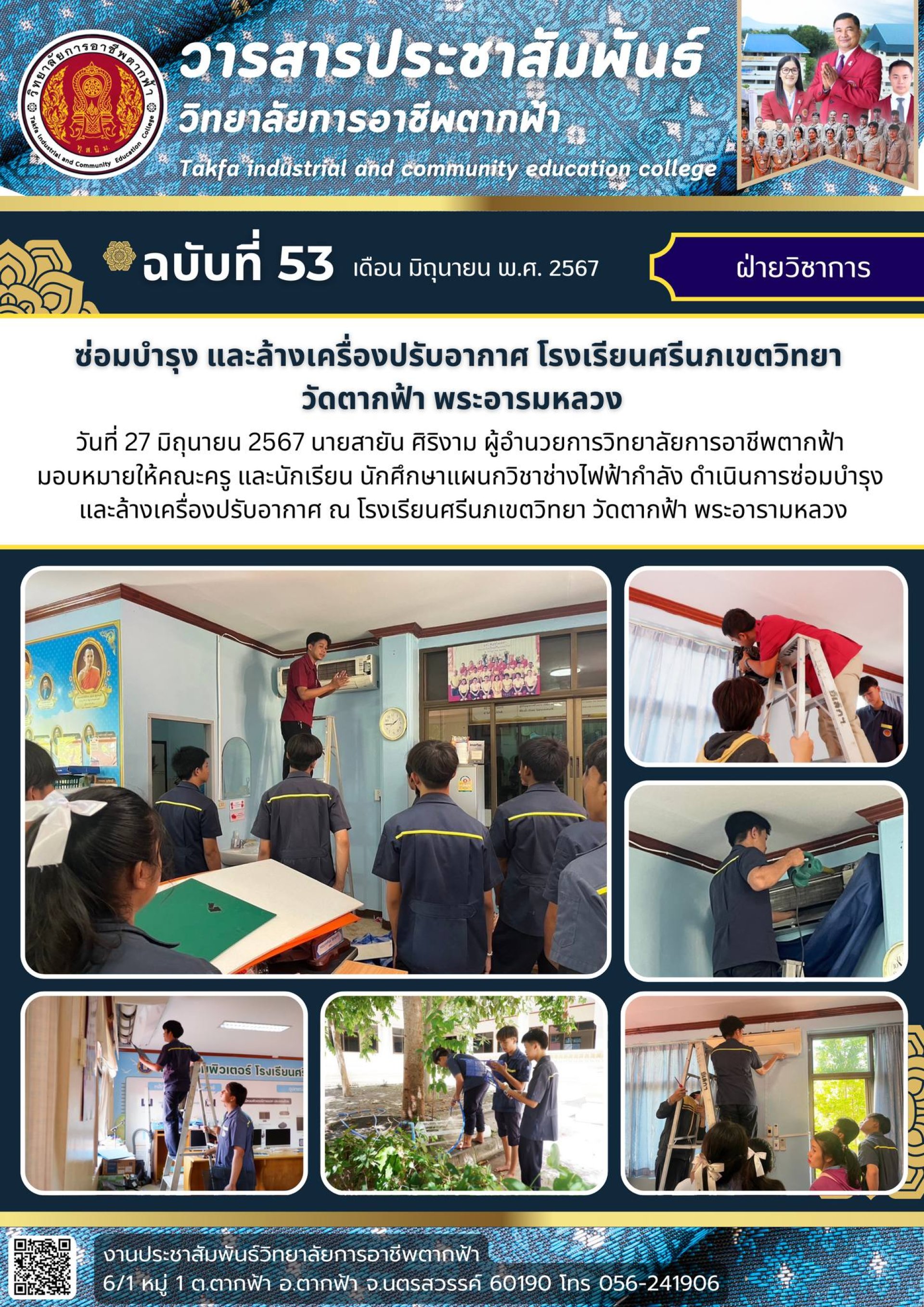 วารสารตากฟ้า ประจำเดือน มิถุนายน 2567 ฉบับที่ 53 ซ่อมบำรุง และล้างเครื่องปรับอากาศ โรงเรียนศรีนภเขตวิทยา วัดตากฟ้า พระอารมหลวง