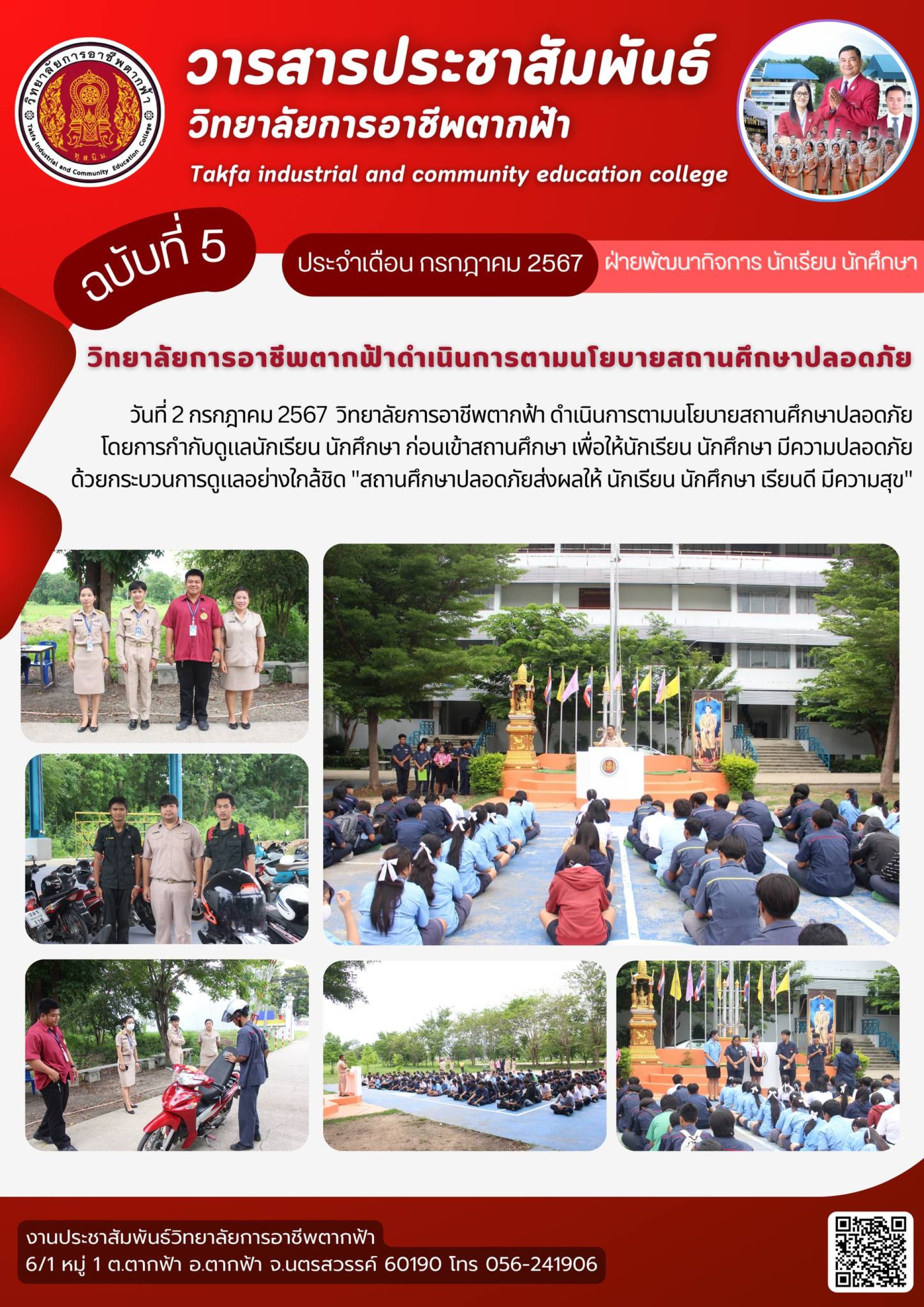 วารสารตากฟ้า ประจำเดือน กรกฎาคม 2567 ฉบับที่ 5 วิทยาลัยการอาชีพตากฟ้าดำเนินการตามนโยบายสถานศึกษาปลอดภัย