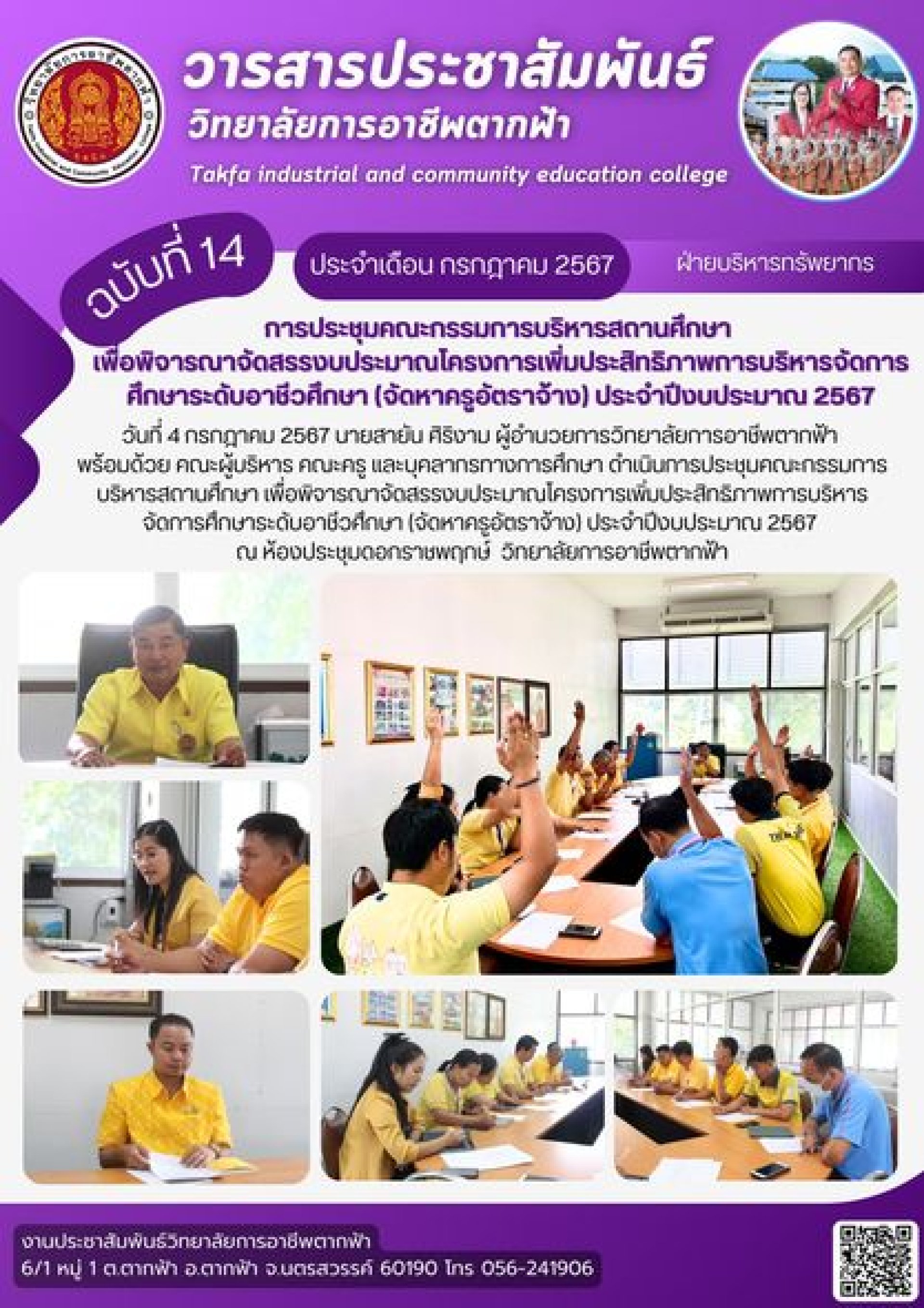 วารสารตากฟ้า ประจำเดือน กรกฎาคม 2567 ฉบับที่ 14 การประชุมคณะกรรมการบริหารสถานศึกษา เพื่อพิจารณาจัดสรรงบประมาณโครงการเพิ่มประสิทธิภาพการบริหารจัดการศึกษาระดับอาชีวศึกษา (จัดหาครูอัตราจ้าง) ประจำปีงบประมาณ 2567