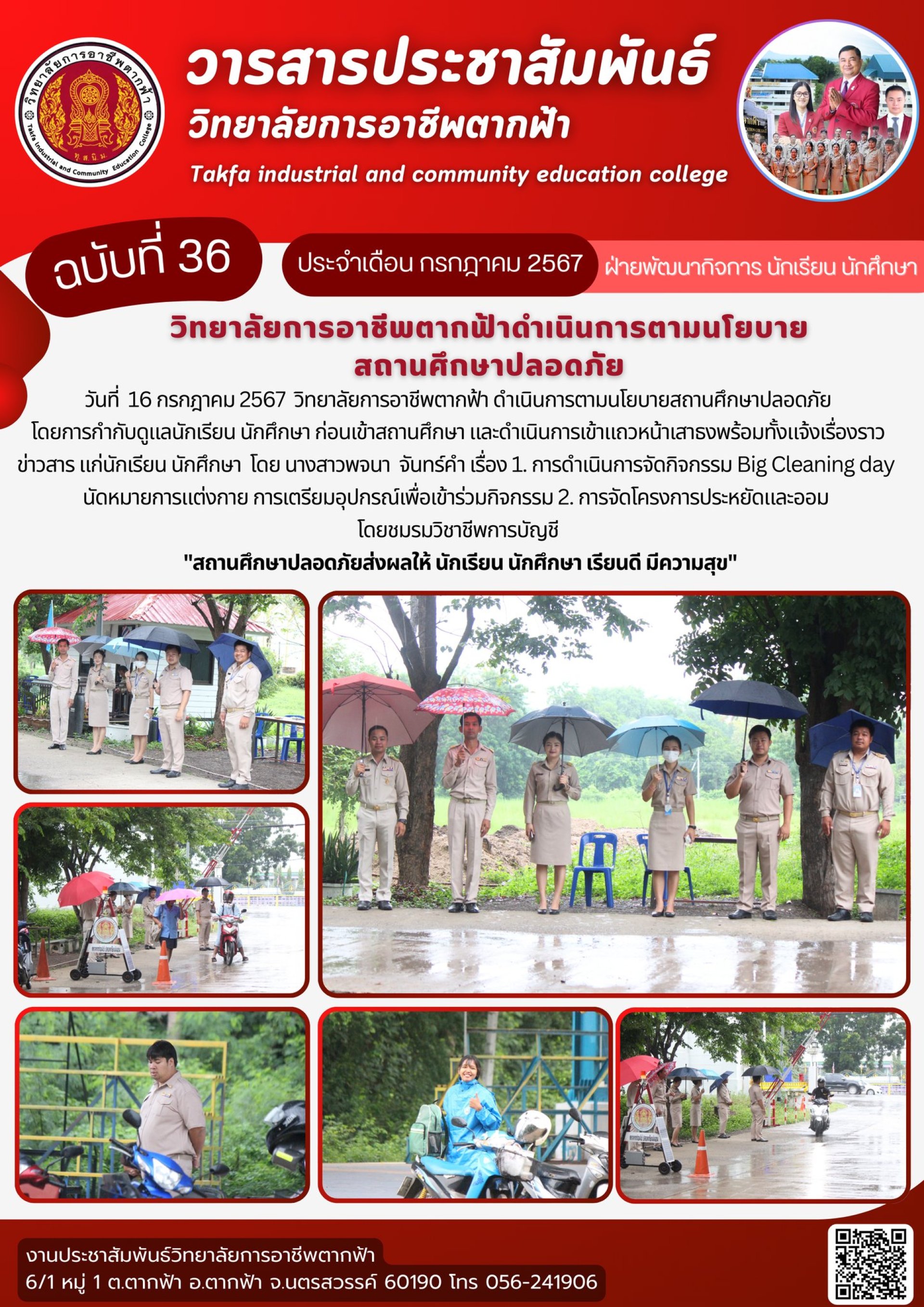 วารสารตากฟ้า ประจำเดือน กรกฎาคม 2567 ฉบับที่ 36 วิทยาลัยการอาชีพตากฟ้าดำเนินการตามนโยบาย สถานศึกษาปลอดภัย