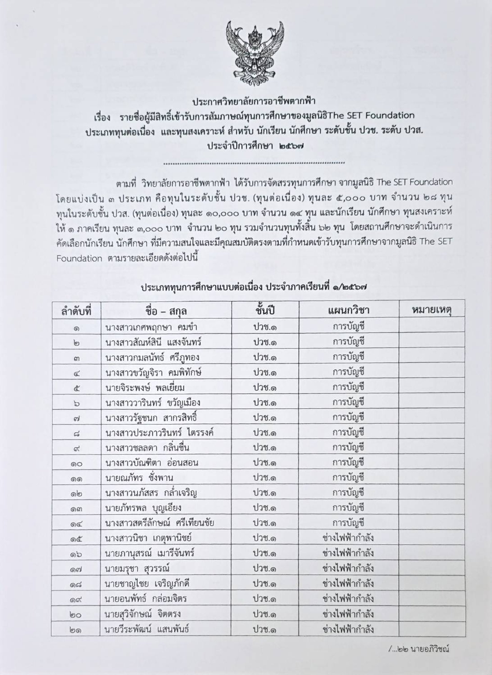ประกาศวิทยาลัยการอาชีพตากฟ้า เรื่อง ประกาศรายชื่อผู้มีสิทธิ์สัมภาษณ์ทุนการศึกษามูลนิธิ The Set Foundation ประเภททุนต่อเนื่อง และประเภททุนสงเคราะห์ ประจำปีการศึกษา 2567 ขอให้นักเรียน นักศึกษาที่มีรายชื่อตามประกาศ เข้ารับการสัมภาษณ์ ในวันพุธที่ 24 กรกฎาคม พ