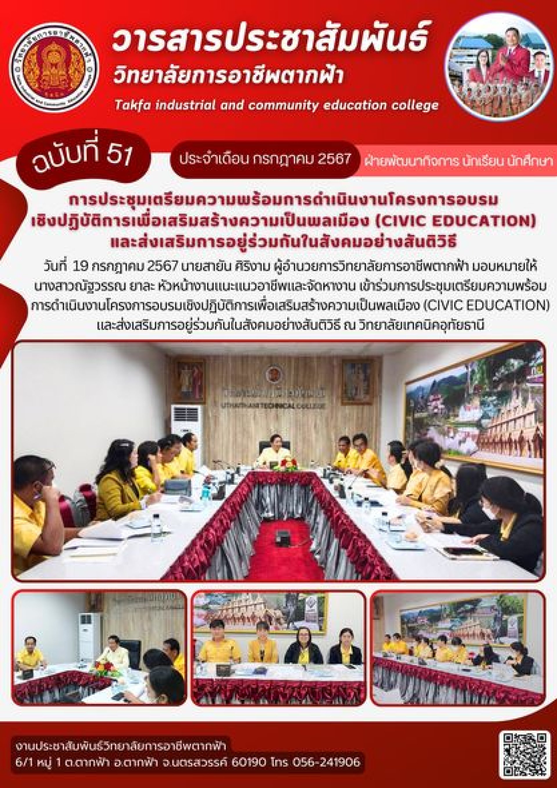 วารสารตากฟ้า ประจำเดือน กรกฎาคม 2567 ฉบับที่ 51 การประชุมเตรียมความพร้อมการดำเนินงานโครงการอบรมเชิงปฏิบัติการเพื่อเสริมสร้างความเป็นพลเมือง (CIVIC EDUCATION) และส่งเสริมการอยู่ร่วมกันในสังคมอย่างสันติวิธี