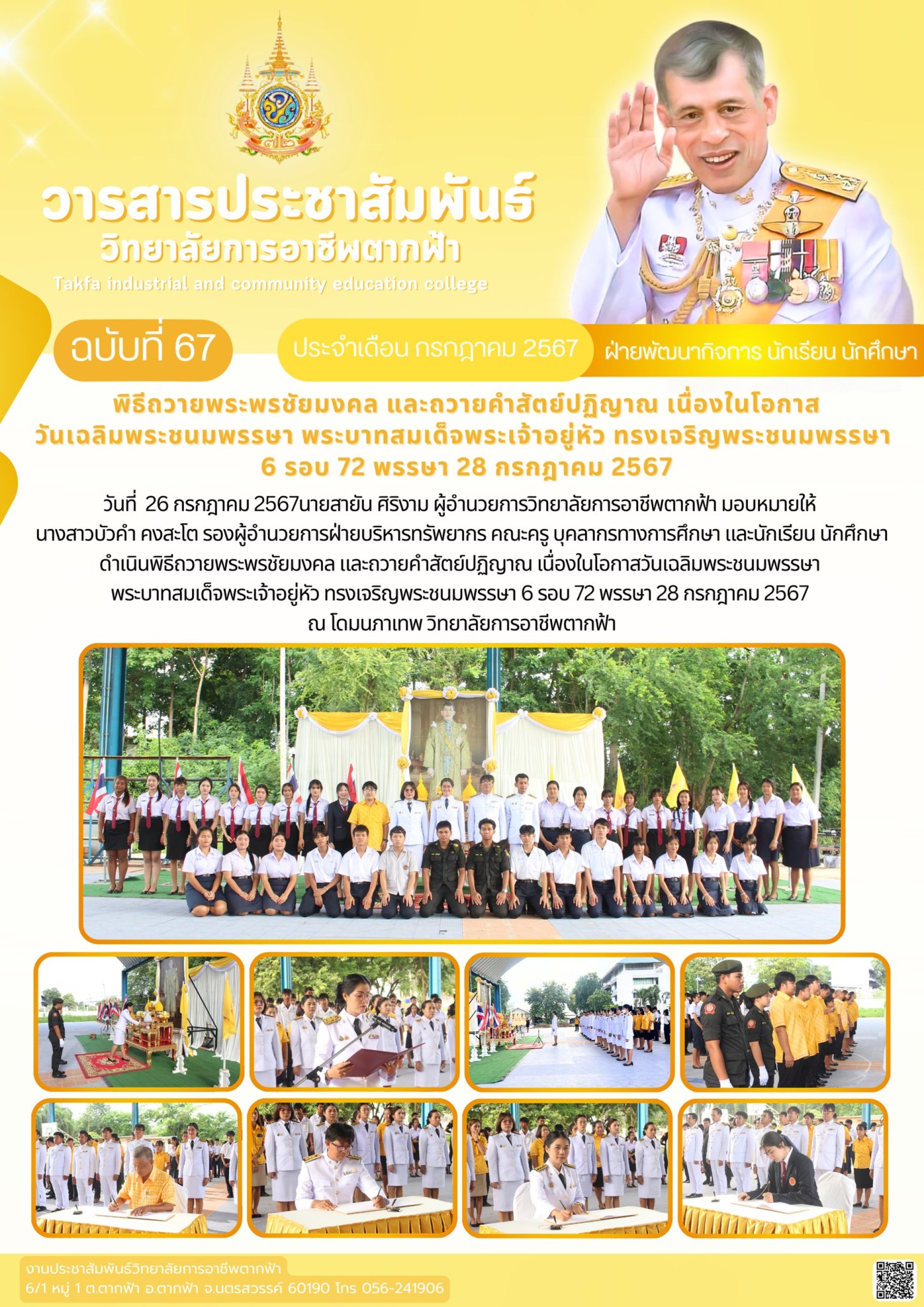วารสารตากฟ้า ประจำเดือน กรกฎาคม 2567 ฉบับที่ 67 พิธีถวายพระพรชัยมงคล และถวายคำสัตย์ปฏิญาณ เนื่องในโอกาสวันเฉลิมพระชนมพรรษา พระบาทสมเด็จพระเจ้าอยู่หัว ทรงเจริญพระชนมพรรษา 6 รอบ 72 พรรษา 28 กรกฎาคม 2567