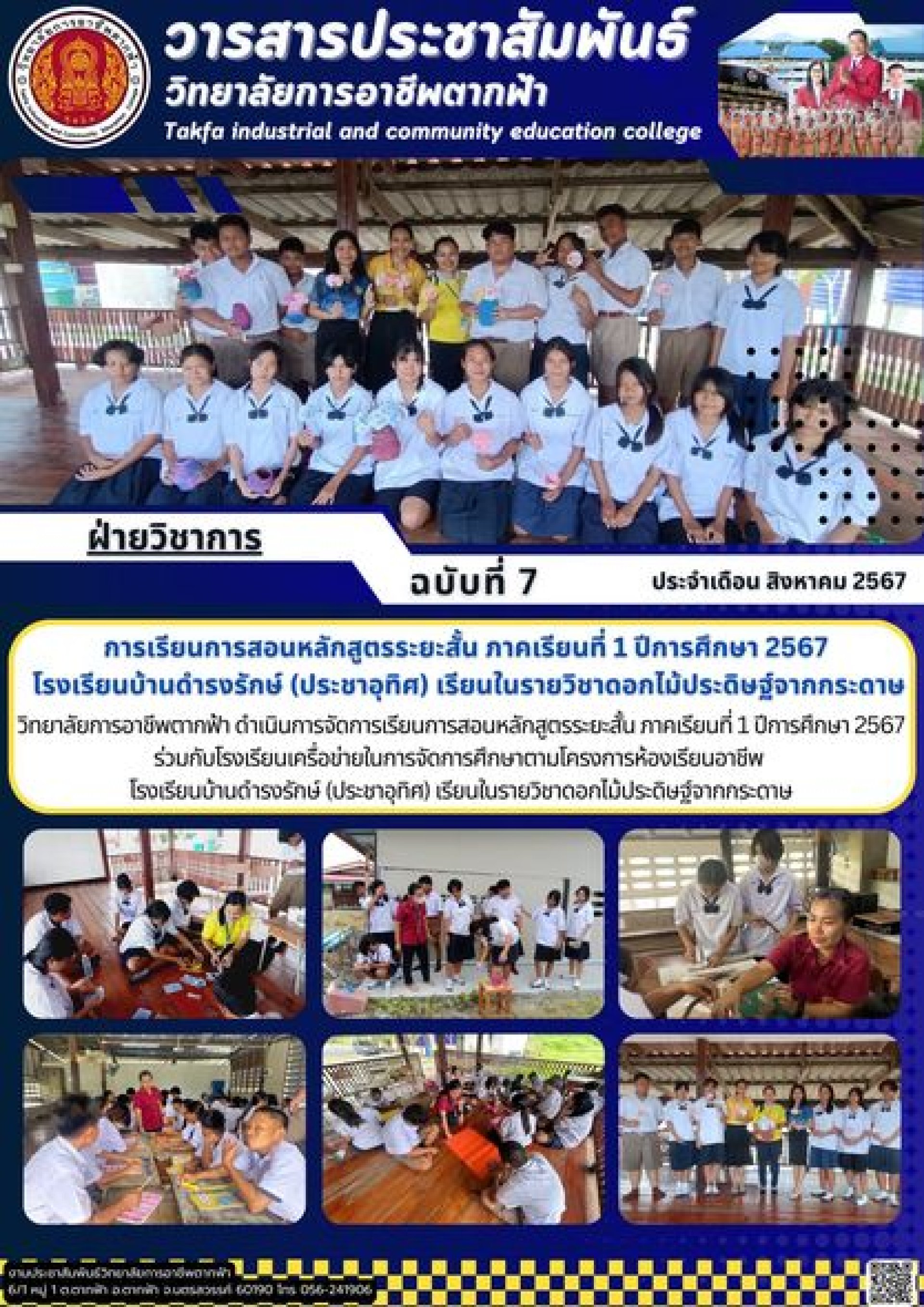 วิทยาลัยการอาชีพตากฟ้า ดำเนินการจัดการเรียนการสอนหลักสูตรระยะสั้น ภาคเรียนที่ 1 ปีการศึกษา 2567 ร่วมกับโรงเรียนเครื่อข่ายในการจัดการศึกษาตามโครงการห้องเรียนอาชีพ โดย โรงเรียนบ้านดำรงรักษ์ (ประชาอุทิศ) เรียนในรายวิชาดอกไม้ประดิษฐ์จากกระดาษ