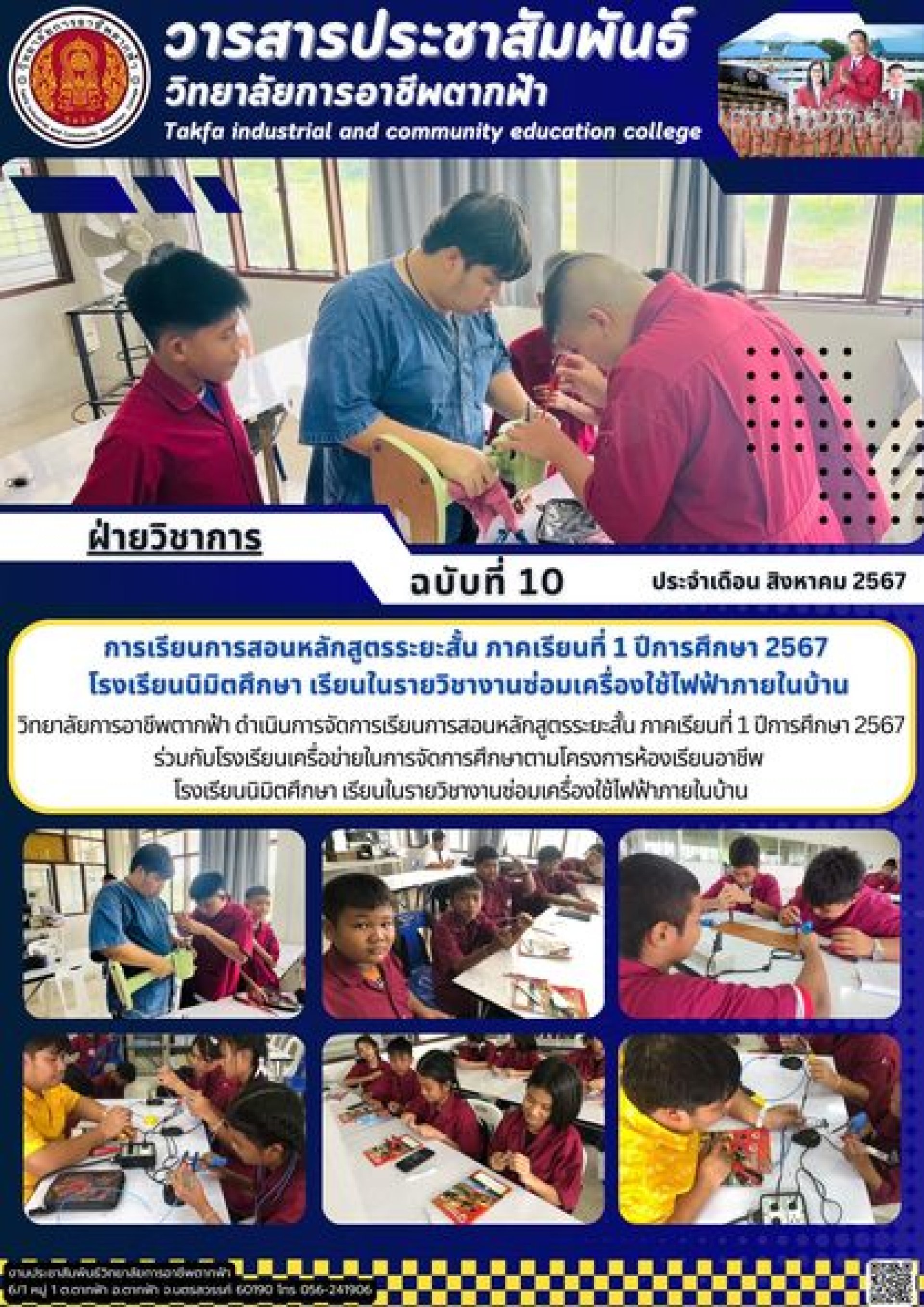 วารสารตากฟ้า ประจำเดือน สิงหาคม 2567 ฉบับที่ 10 การเรียนการสอนหลักสูตรระยะสั้น ภาคเรียนที่ 1 ปีการศึกษา 2567 โรงเรียนนิมิตศึกษา เรียนในรายวิชางานซ่อมเครื่องใช้ไฟฟ้าภายในบ้าน