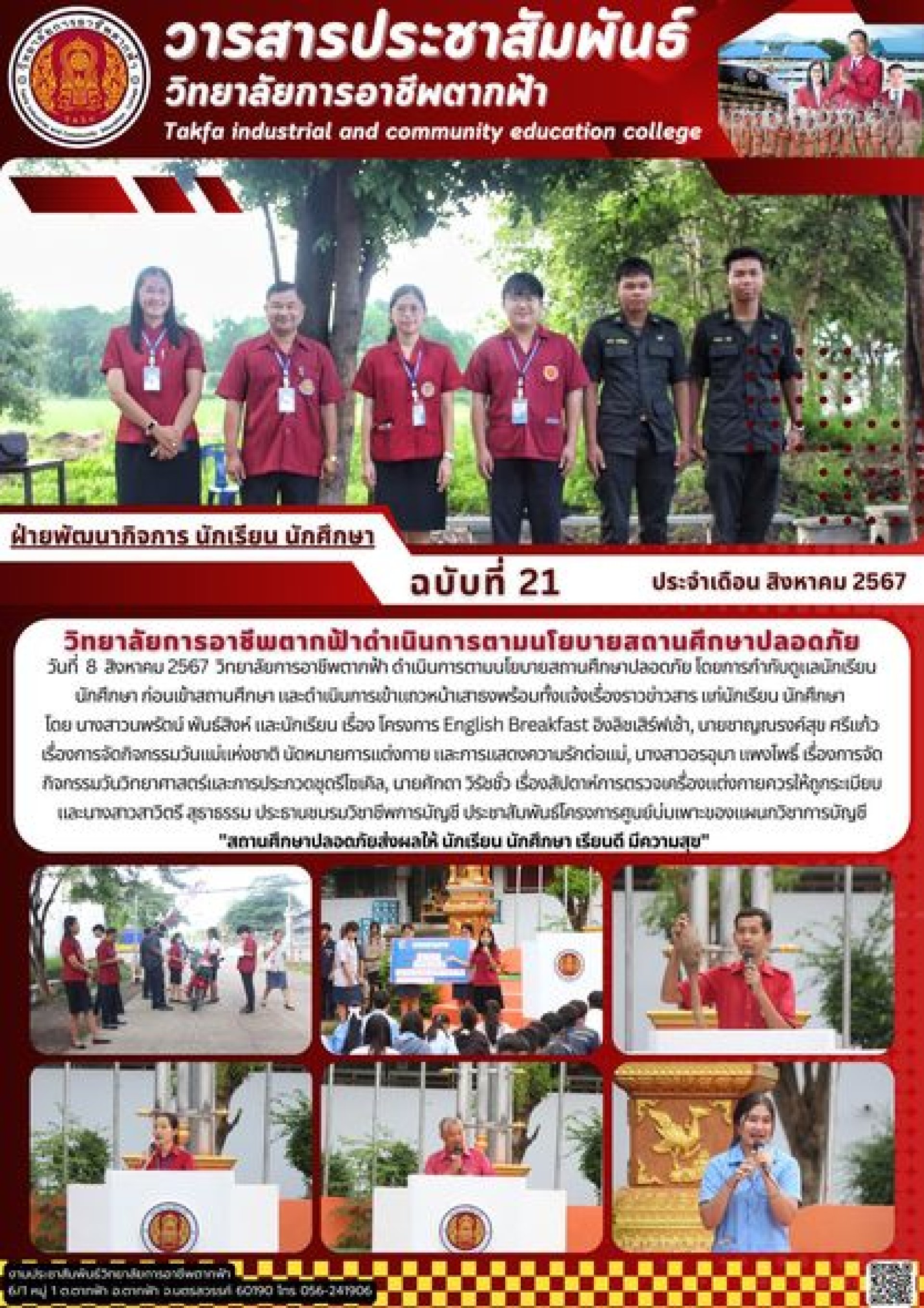 วารสารตากฟ้า ประจำเดือน สิงหาคม 2567 ฉบับที่ 21 วิทยาลัยการอาชีพตากฟ้าดำเนินการตามนโยบายสถานศึกษาปลอดภัย