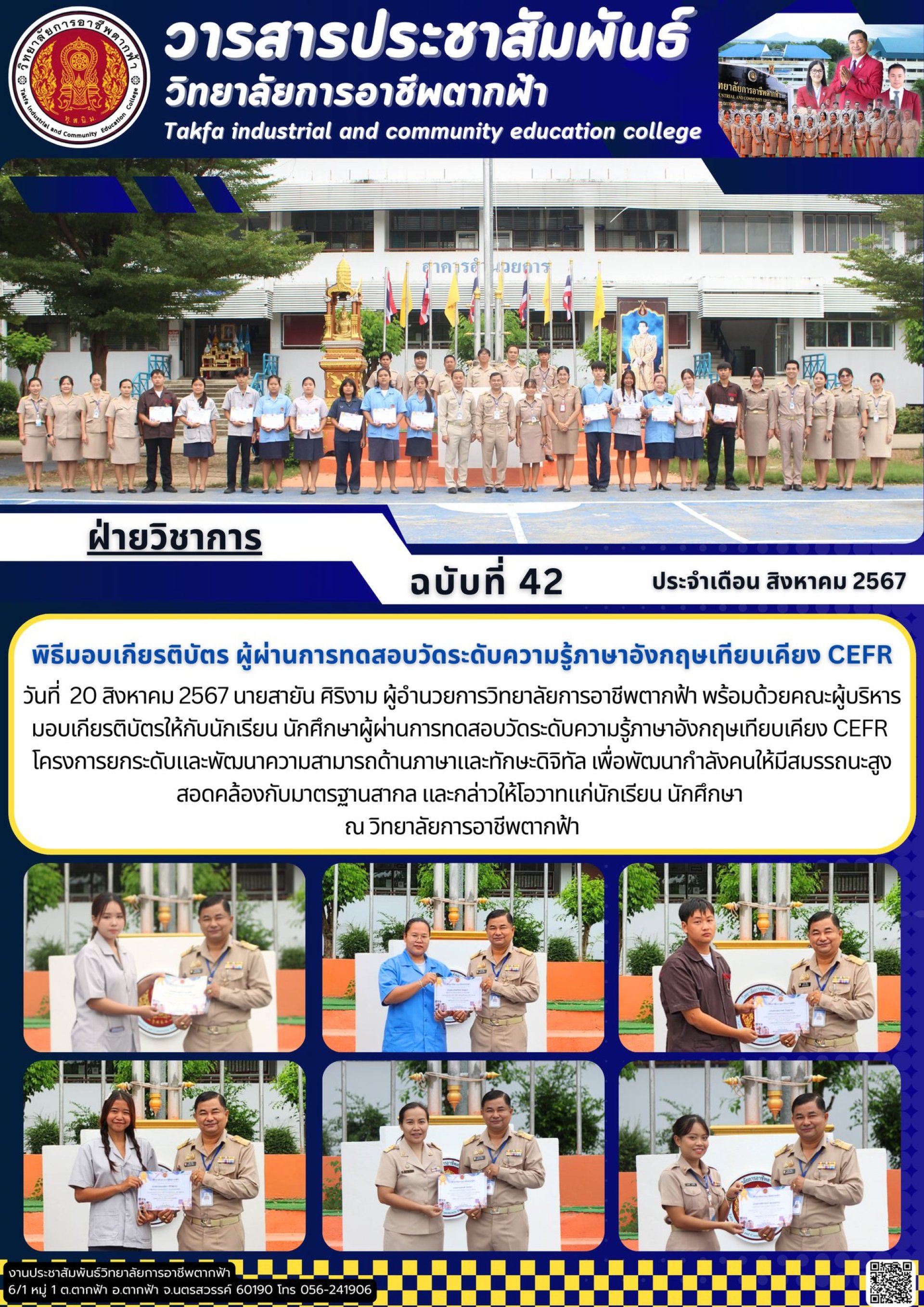 วารสารตากฟ้า ประจำเดือน สิงหาคม 2567 ฉบับที่ 42 พิธีมอบเกียรติบัตร ผู้ผ่านการทดสอบวัดระดับความรู้ภาษาอังกฤษเทียบเคียง CEFR