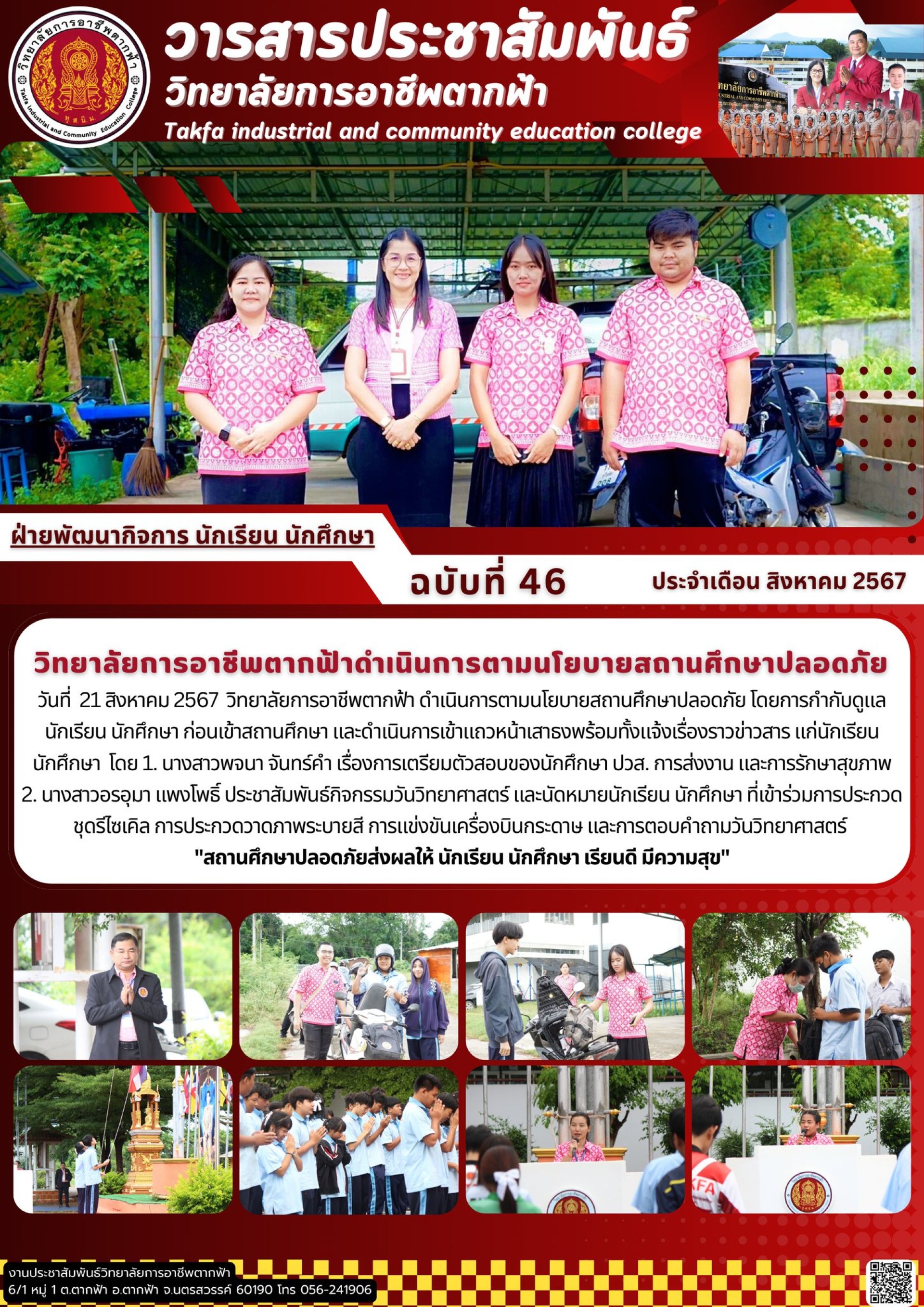 วารสารตากฟ้า ประจำเดือน สิงหาคม 2567 ฉบับที่ 46 วิทยาลัยการอาชีพตากฟ้าดำเนินการตามนโยบายสถานศึกษาปลอดภัย
