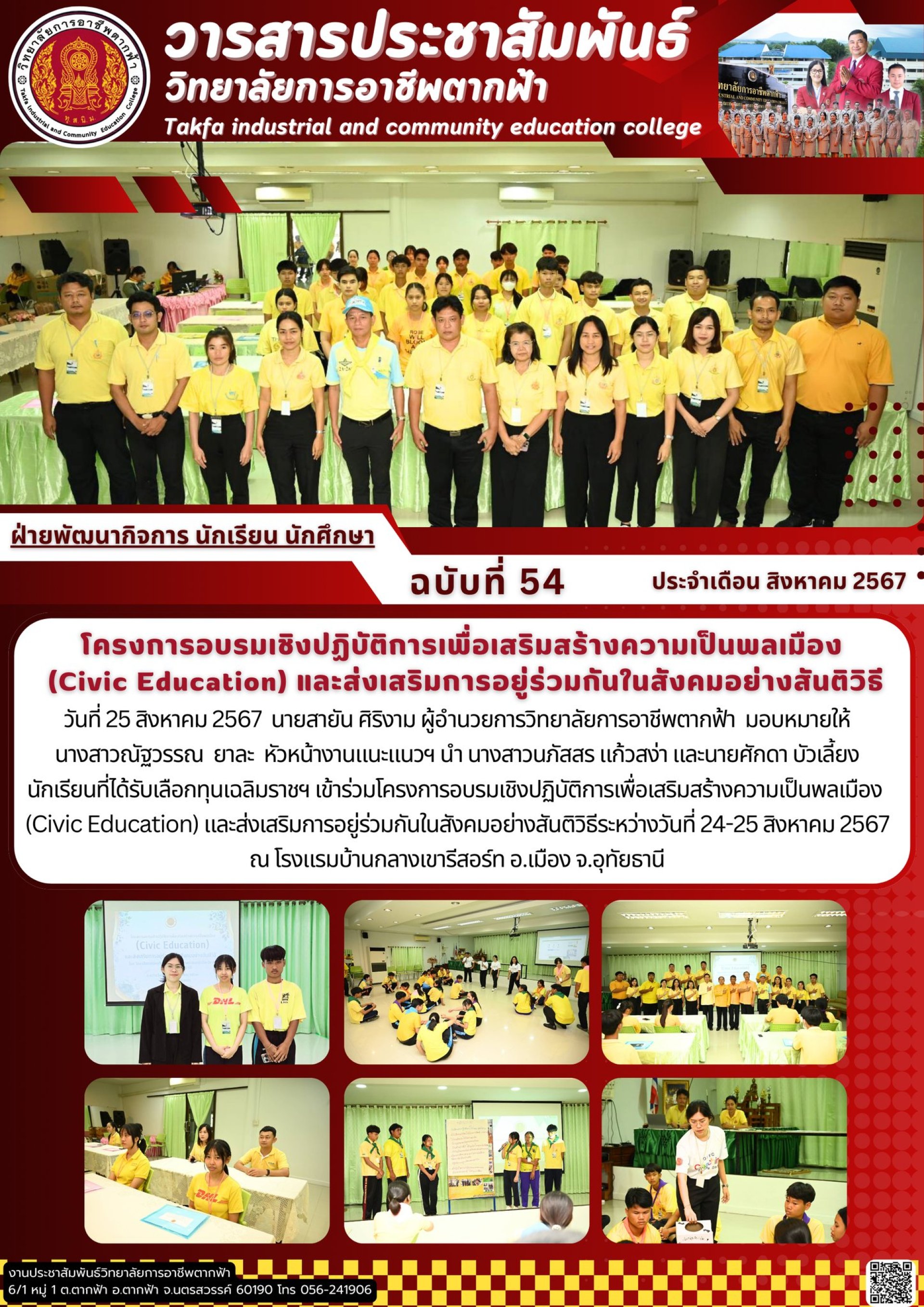 วารสารตากฟ้า ประจำเดือน สิงหาคม 2567 ฉบับที่ 54 โครงการอบรมเชิงปฏิบัติการเพื่อเสริมสร้างความเป็นพลเมือง(Civic Education) และส่งเสริมการอยู่ร่วมกันในสังคมอย่างสันติวิธี