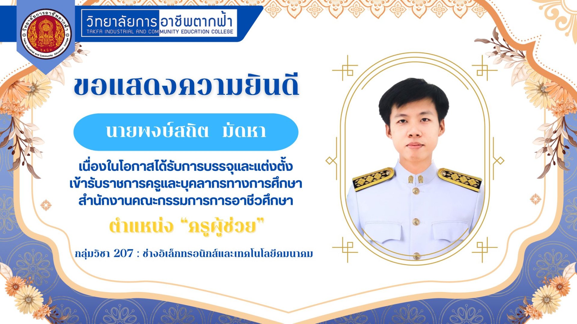 วิทยาลัยการอาชีพตากฟ้า ขอแสดงความยินดีกับ นายพงษ์สถิต มัดหา ครูแผนกวิชาช่างอิเล็กทรอนิกส์ เนื่องในโอกาสได้รับการบรรจุและแต่งตั้งเข้ารับราชการครูและบุคลากรทางการศึกษาสำนักงานคณะกรรมการการอาชีวศึกษา กระทรวงศึกษาธิการ