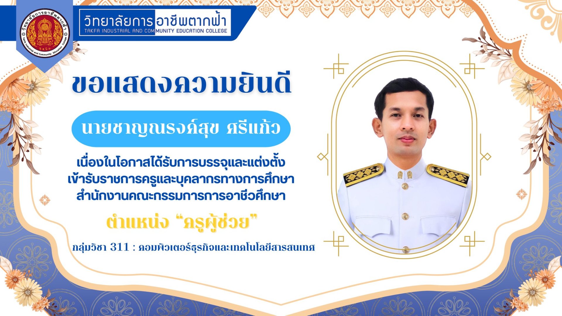 วิทยาลัยการอาชีพตากฟ้า ขอแสดงความยินดีกับ นายชาญณรงค์สุข ศรีแก้ว ครูแผนกวิชาคอมพิวเตอร์ธุรกิจ เนื่องในโอกาสได้รับการบรรจุและแต่งตั้งเข้ารับราชการครูและบุคลากรทางการศึกษาสำนักงานคณะกรรมการการอาชีวศึกษา กระทรวงศึกษาธิการ