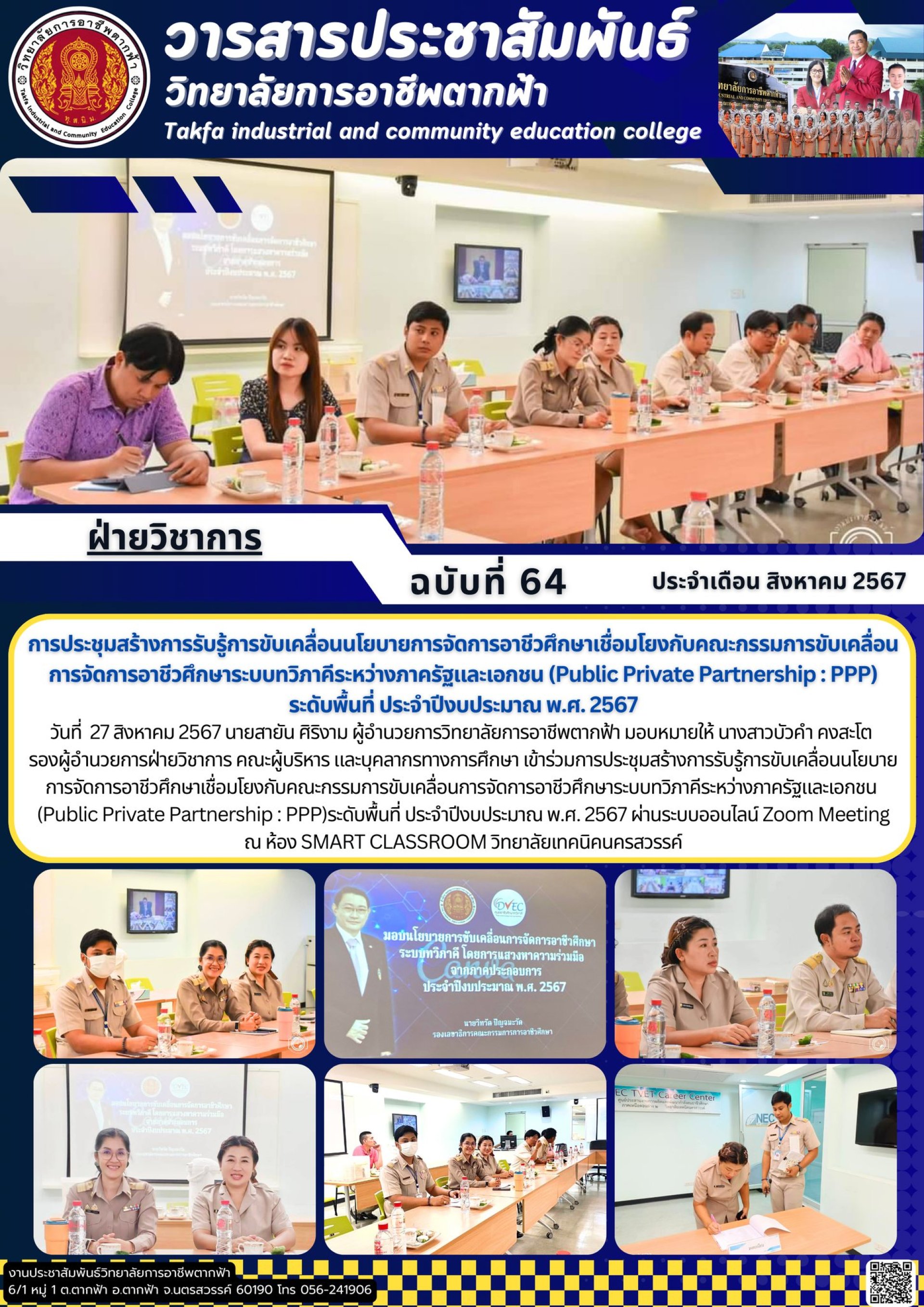วารสารตากฟ้า ประจำเดือน สิงหาคม 2567 ฉบับที่ 64 การประชุมสร้างการรับรู้การขับเคลื่อนนโยบายการจัดการอาชีวศึกษาเชื่อมโยงกับคณะกรรมการขับเคลื่อนการจัดการอาชีวศึกษาระบบทวิภาคีระหว่างภาครัฐและเอกชน (Public Private Partnership : PPP) ระดับพื้นที่ ประจำปีงบประมา
