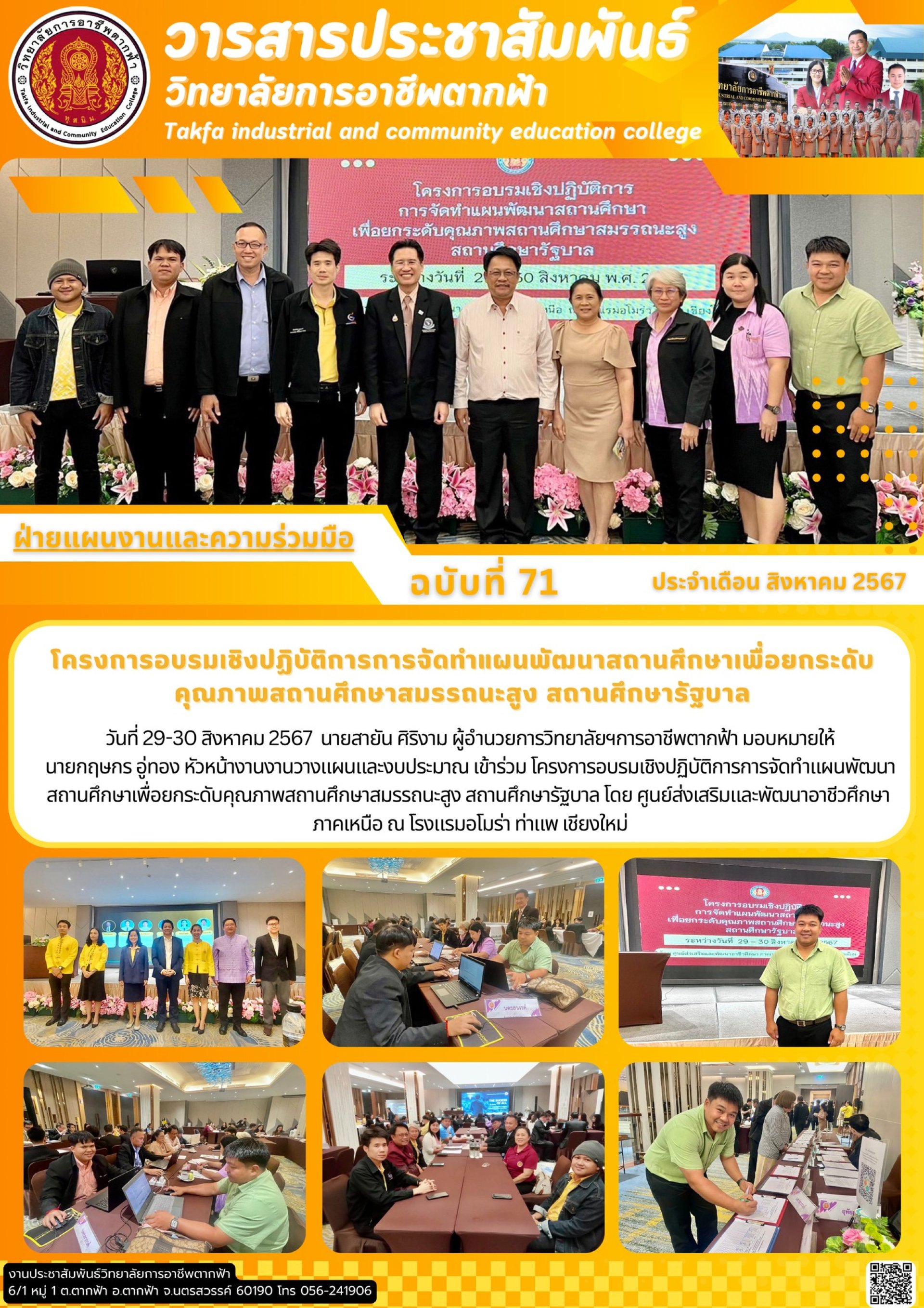 วารสารตากฟ้า ประจำเดือน สิงหาคม 2567 ฉบับที่ 71 โครงการอบรมเชิงปฏิบัติการการจัดทำแผนพัฒนาสถานศึกษาเพื่อยกระดับคุณภาพสถานศึกษาสมรรถนะสูง สถานศึกษารัฐบาล