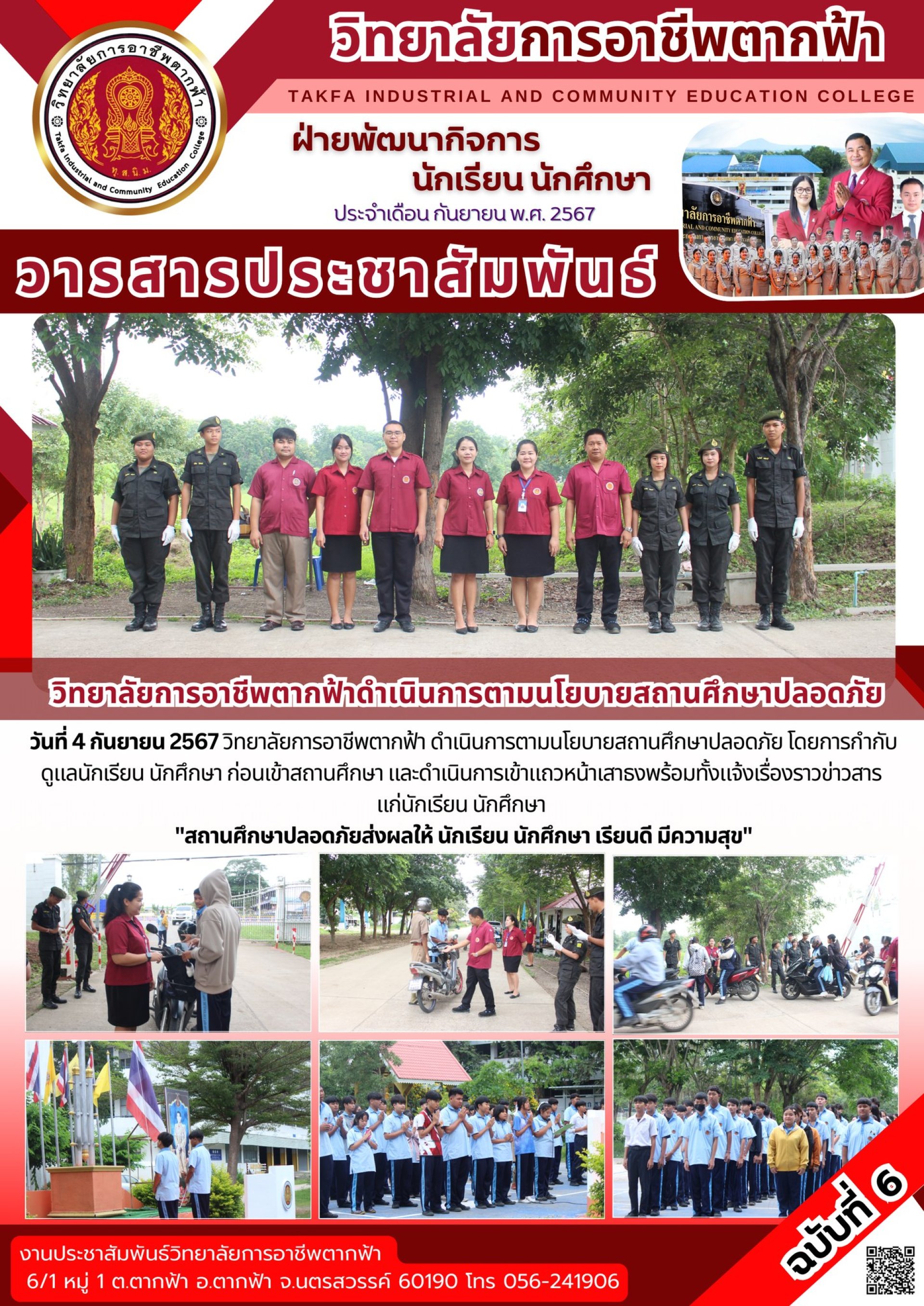 วารสารตากฟ้า ประจำเดือน กันยายน 2567 ฉบับที่ 6 วิทยาลัยการอาชีพตากฟ้าดำเนินการตามนโยบายสถานศึกษาปลอดภัย