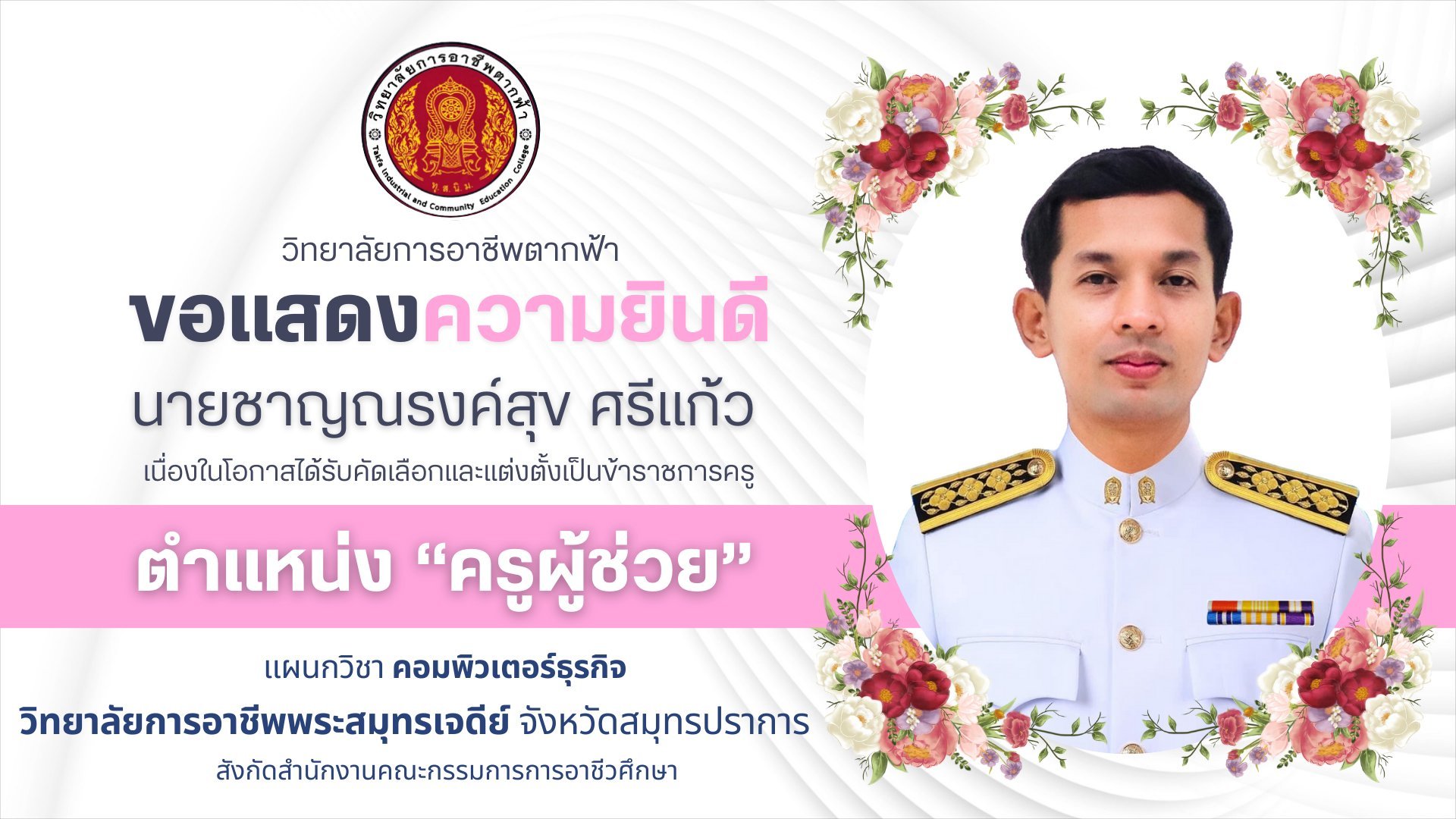 วิทยาลัยการอาชีพตากฟ้า ขอแสดงความยินดีกับ... นายชาญณรงค์สุข ศรีแก้ว เนื่องในโอกาสได้รับคัดเลือกและแต่งตั้งเป็นข้าราชการครู ในตำแหน่ง "ครูผู้ช่วย" ครูแผนกวิชาคอมพิวเตอร์ธุรกิจ วิทยาลัยการอาชีพพระสมุทรเจดีย์ จังหวัดสมุทรปราการ ด้วยความยินดียิ่