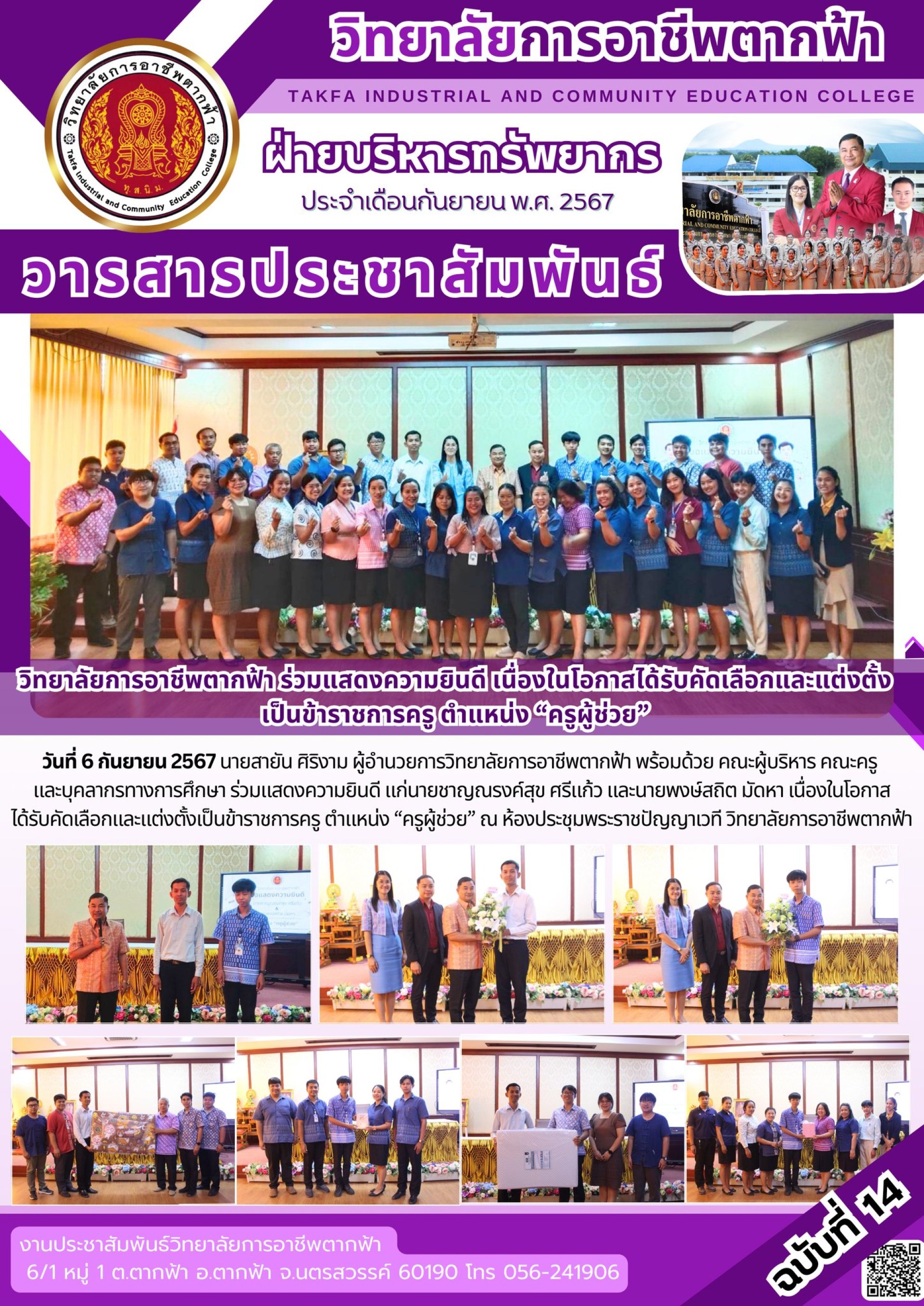 วารสารตากฟ้า ประจำเดือน กันยายน 2567 ฉบับที่ 14 วิทยาลัยการอาชีพตากฟ้า ร่วมแสดงความยินดีเนื่องในโอกาสได้รับคัดเลือกและแต่งตั้งเป็นข้าราชการครู ตำแหน่ง ครูผู้ช่วย