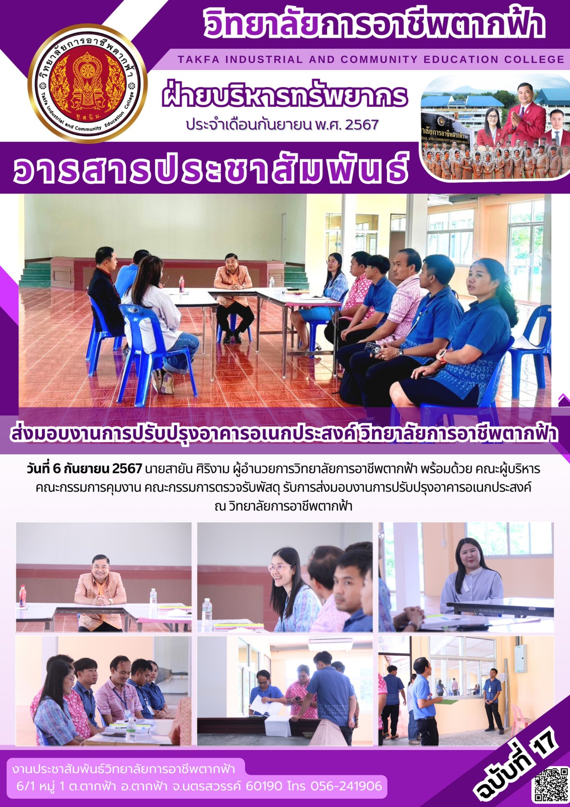วารสารตากฟ้า ประจำเดือน กันยายน 2567 ฉบับที่ 17 ส่งมอบงานการปรับปรุงอาคารอเนกประสงค์ วิทยาลัยการอาชีพตากฟ้า