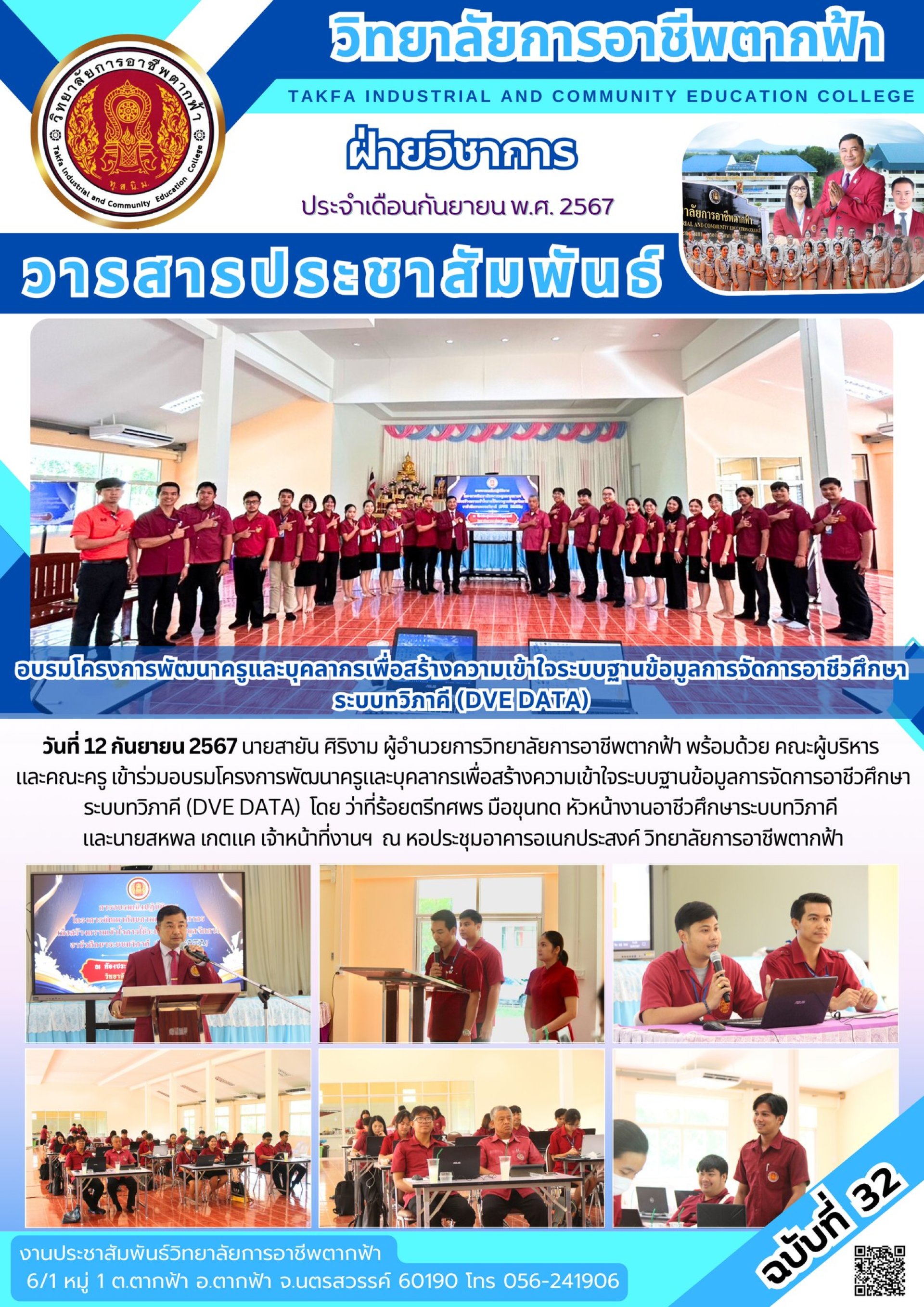 วารสารตากฟ้า ประจำเดือน กันยายน 2567 ฉบับที่ 32 อบรมโครงการพัฒนาครูและบุคลากรเพื่อสร้างความเข้าใจระบบฐานข้อมูลการจัดการอาชีวศึกษาระบบทวิภาคี (DVE DATA)