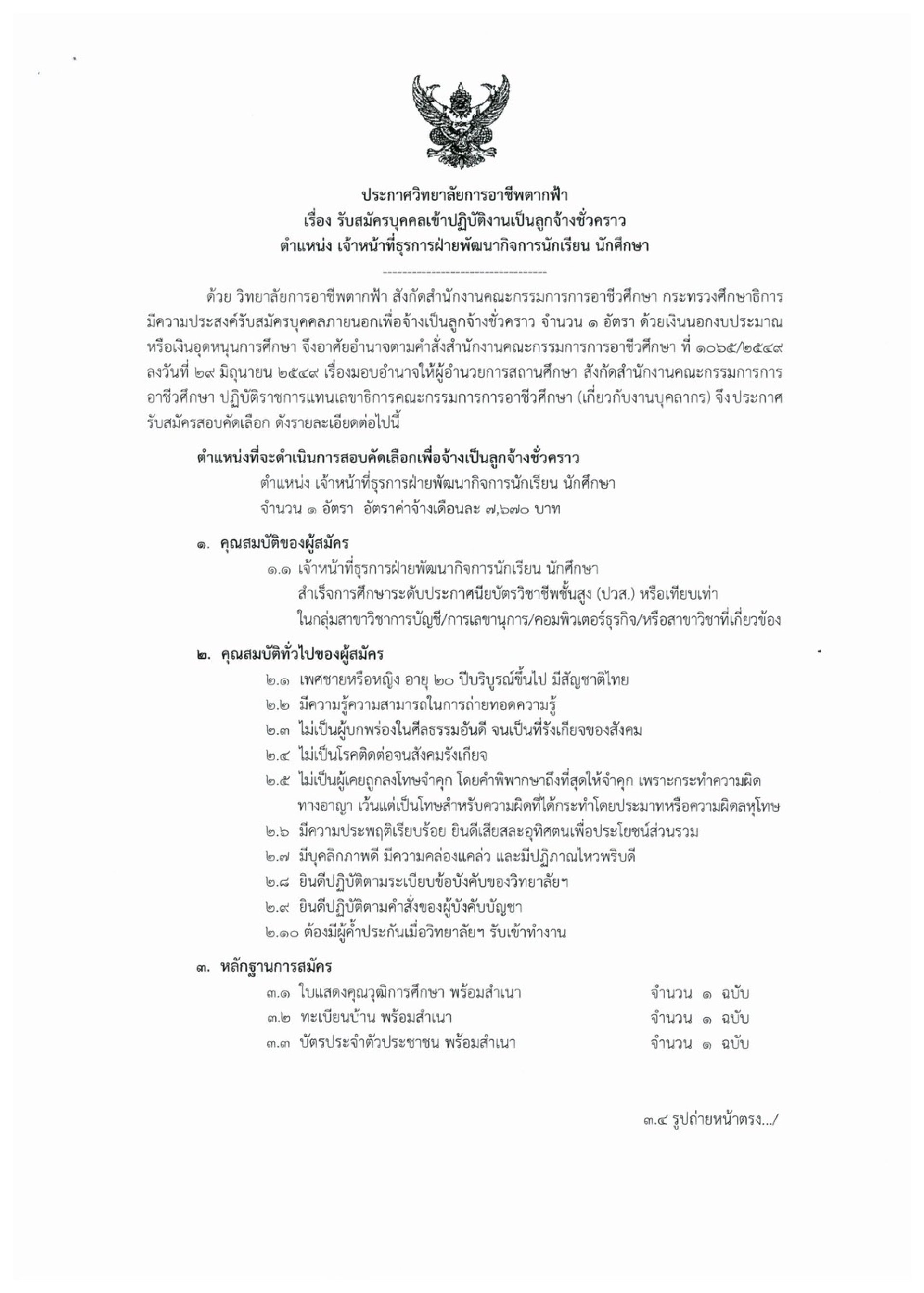 ประกาศวิทยาลัยการอาชีพตากฟ้า เรื่อง รับสมัครบุคคลเข้าปฏิบัติงานเป็นลูกจ้างชั่วคราว วิทยาลัยการอาชีพตากฟ้า มีความประสงค์รับสมัครบุคคลภายนอกเพื่อจ้างเป็นลูกจ้างชั่วคราว จำนวน ๑ อัตรา ๑. ตำแหน่ง เจ้าหน้าที่ธุรการฝ่ายพัฒนากิจการนักเรียน นักศึกษา จำนวน ๑ อัตรา