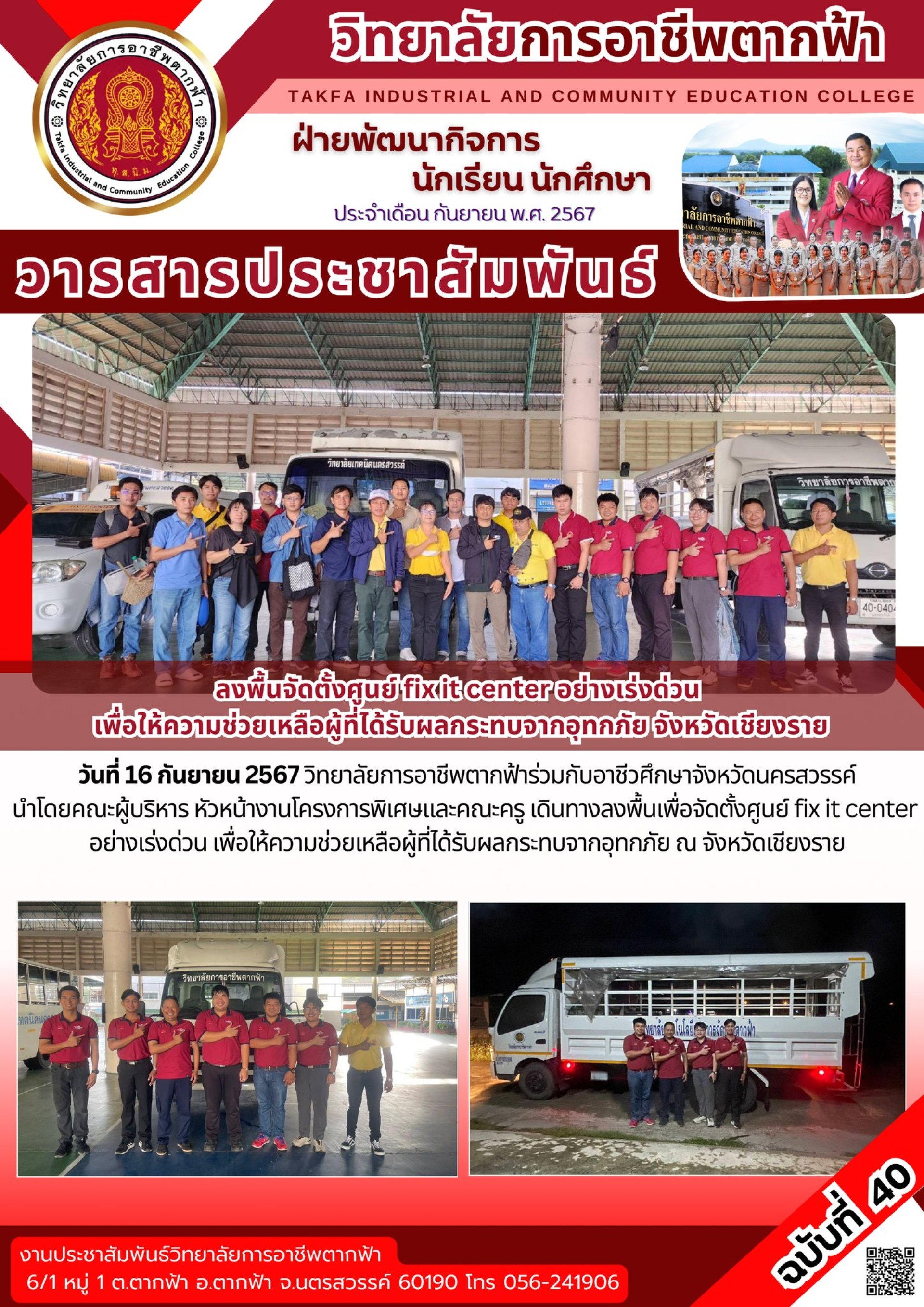 วันที่ 16 กันยายน 2567 วิทยาลัยการอาชีพตากฟ้าร่วมกับอาชีวศึกษาจังหวัดนครสวรรค์ นำโดยคณะผู้บริหาร หัวหน้างานโครงการพิเศษและคณะครู เดินทางลงพื้นเพื่อจัดตั้งศูนย์ fix it center อย่างเร่งด่วน เพื่อให้ความช่วยเหลือผู้ที่ได้รับผลกระทบจากอุทกภัย ณ จังหวัดเชียงราย