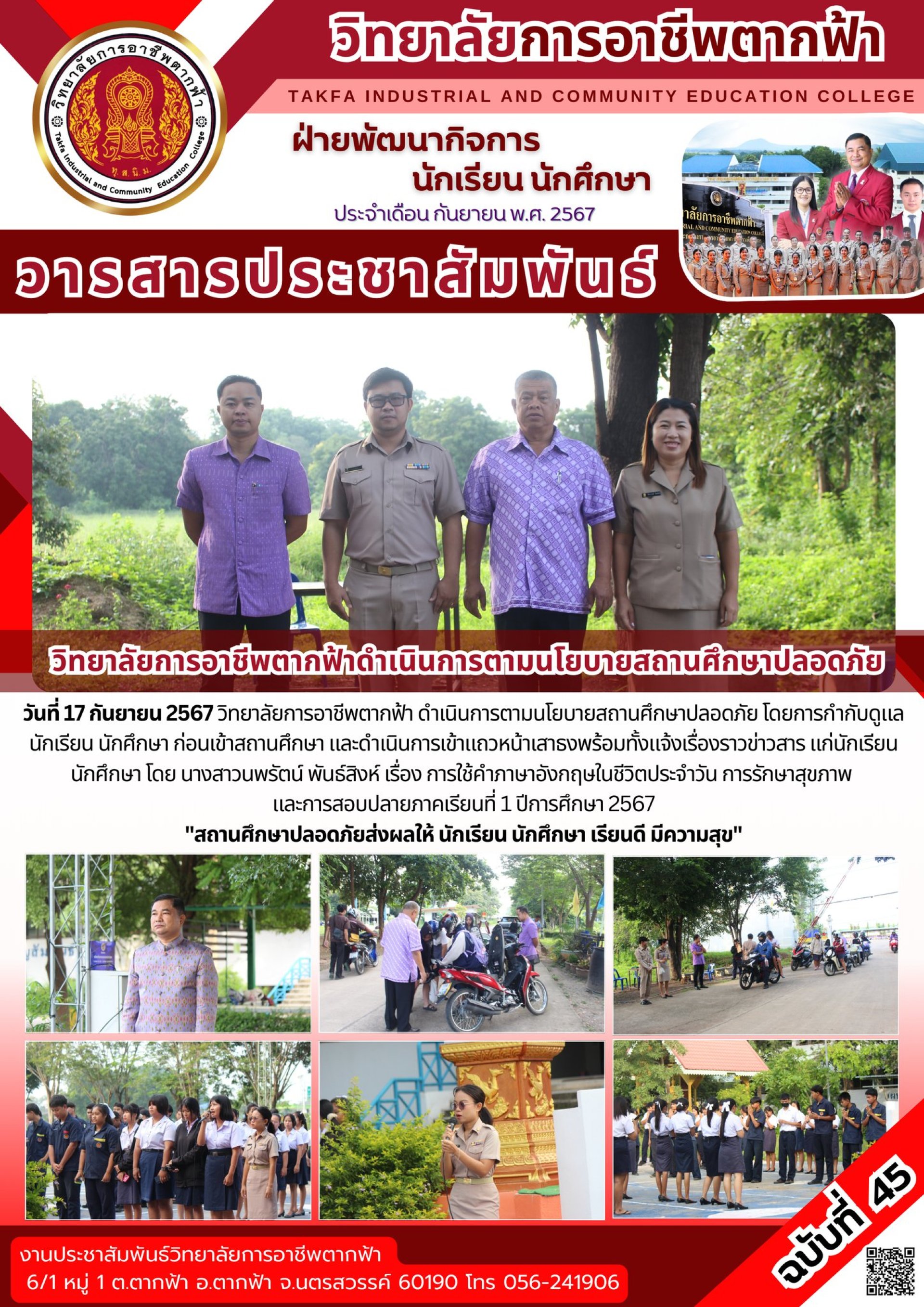 วารสารตากฟ้า ประจำเดือน กันยายน 2567 ฉบับที่ 45 วิทยาลัยการอาชีพตากฟ้าดำเนินการตามนโยบายสถานศึกษาปลอดภัย