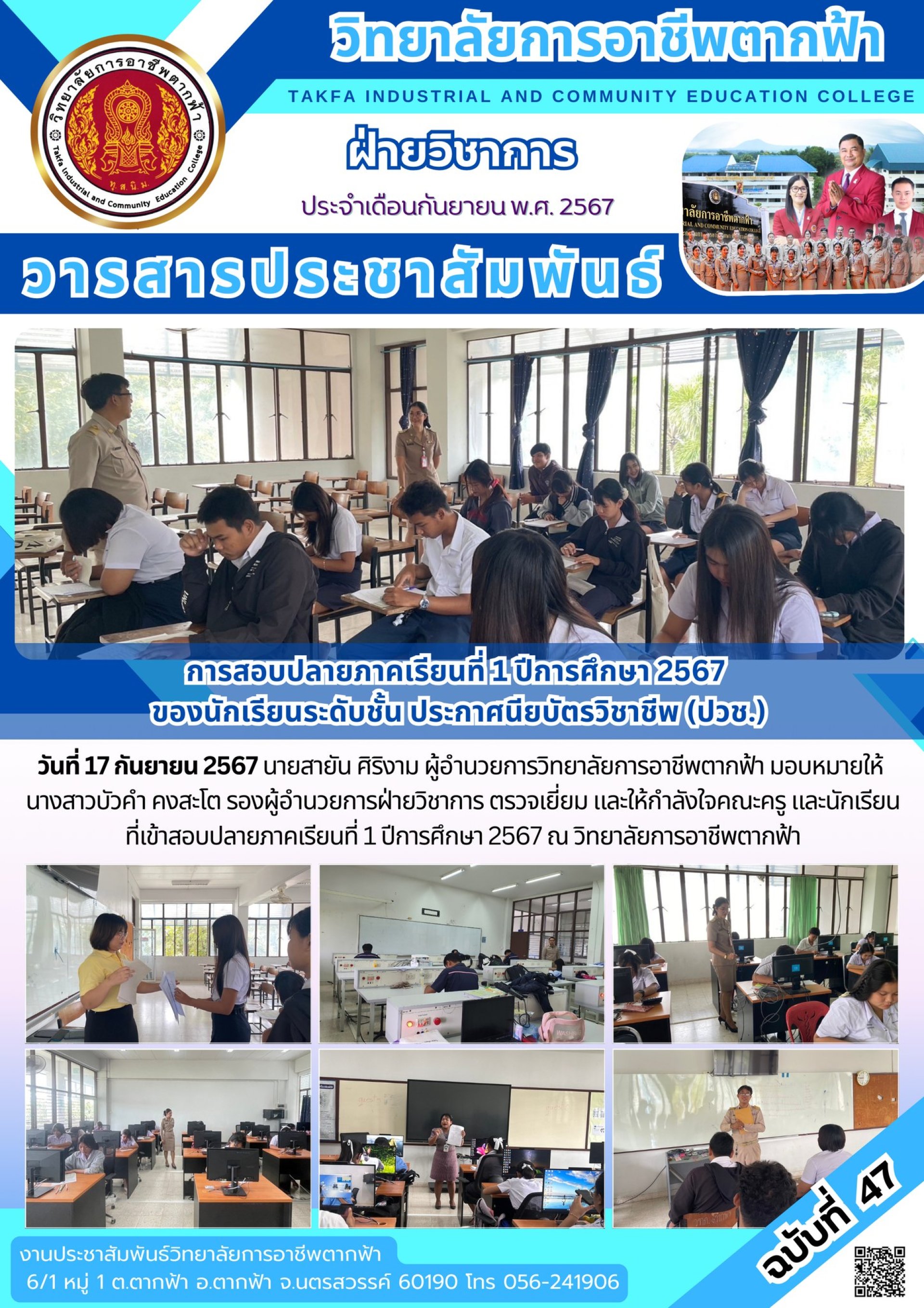 วารสารตากฟ้า ประจำเดือน กันยายน 2567 ฉบับที่ 47 การสอบปลายภาคเรียนที่ 1 ปีการศึกษา 2567 ของนักเรียนระดับชั้น ประกาศนียบัตรวิชาชีพ (ปวช.)