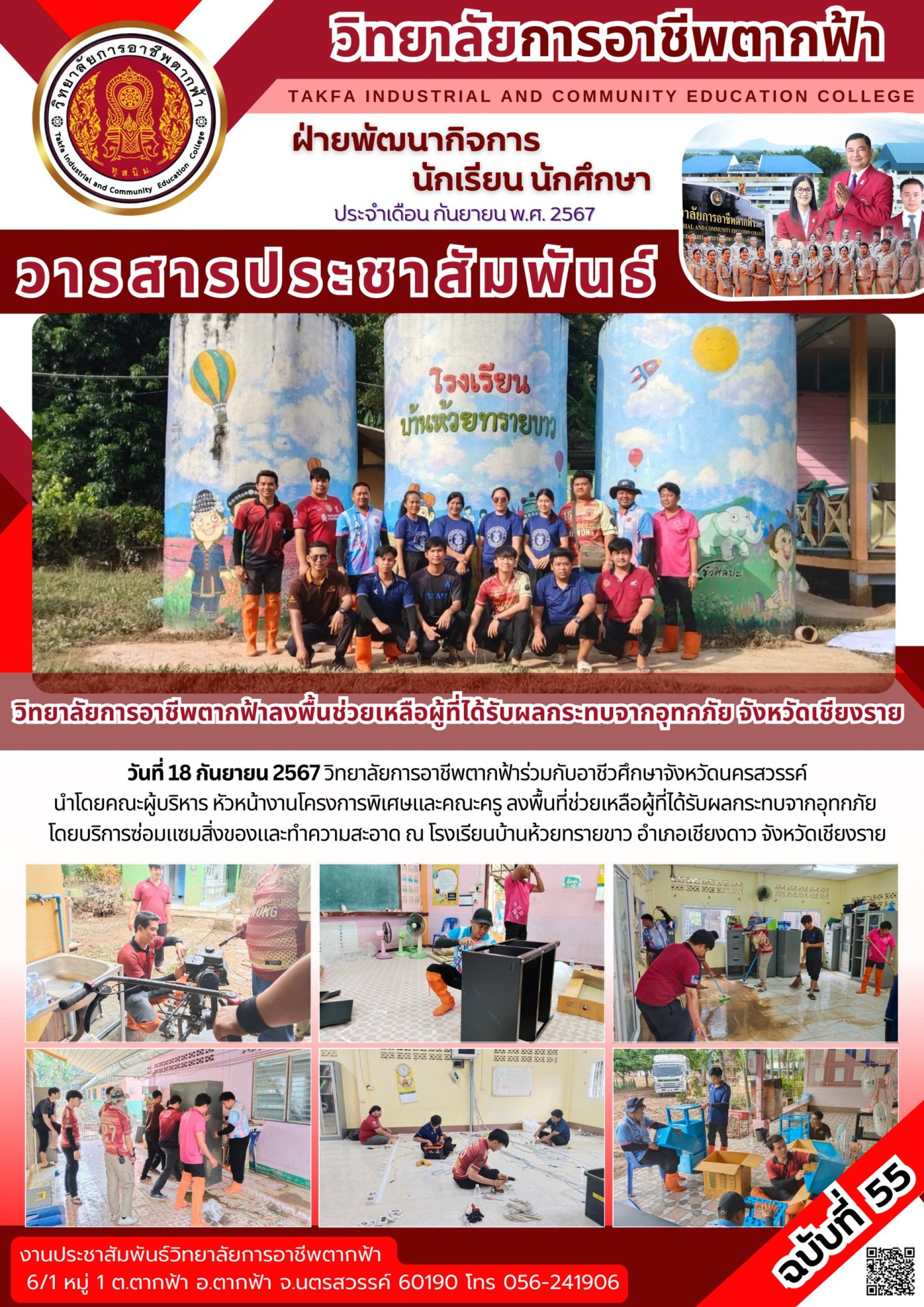 วารสารตากฟ้า ประจำเดือน กันยายน 2567 ฉบับที่ 55 วิทยาลัยการอาชีพตากฟ้าลงพื้นช่วยเหลือผู้ที่ได้รับผลกระทบจากอุทกภัย จังหวัดเชียงราย