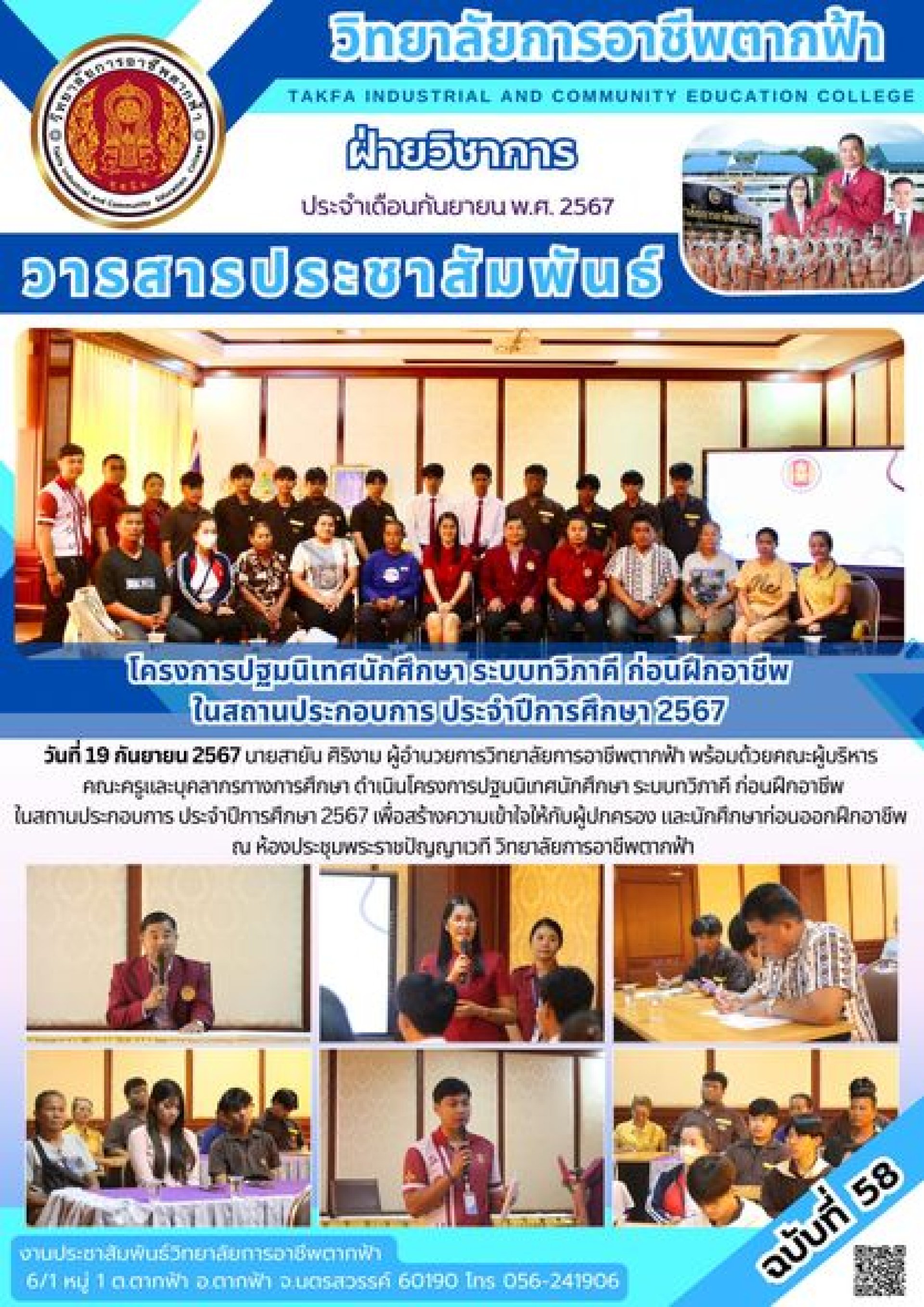 วารสารตากฟ้า ประจำเดือน กันยายน 2567 ฉบับที่ 58 โครงการปฐมนิเทศนักศึกษา ระบบทวิภาคี ก่อนฝึกอาชีพในสถานประกอบการ ประจำปีการศึกษา 2567