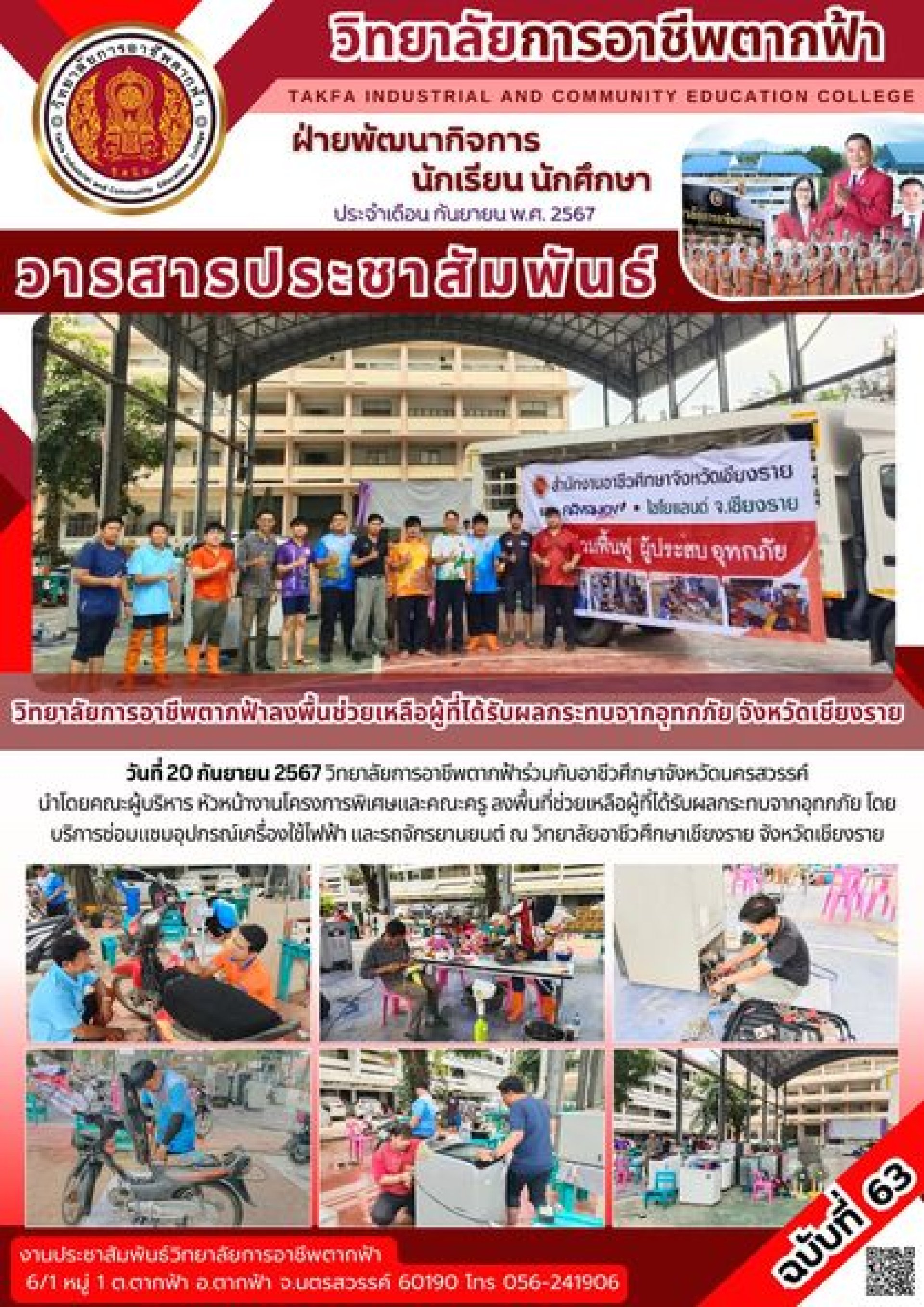 วารสารตากฟ้า ประจำเดือน กันยายน 2567 ฉบับที่ 63 วิทยาลัยการอาชีพตากฟ้าลงพื้นช่วยเหลือผู้ที่ได้รับผลกระทบจากอุทกภัย จังหวัดเชียงราย