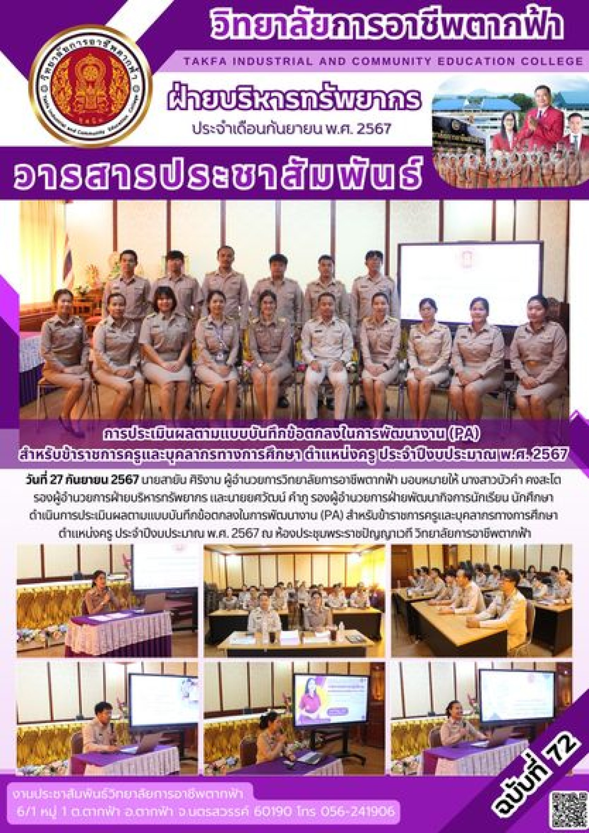 วารสารตากฟ้า ประจำเดือน กันยายน 2567 ฉบับที่ 72 การประเมินผลตามแบบบันทึกข้อตกลงในการพัฒนางาน (PA) สำหรับข้าราชการครูและบุคลากรทางการศึกษา ตำแหน่งครู ประจำปีงบประมาณ พ.ศ. 2567