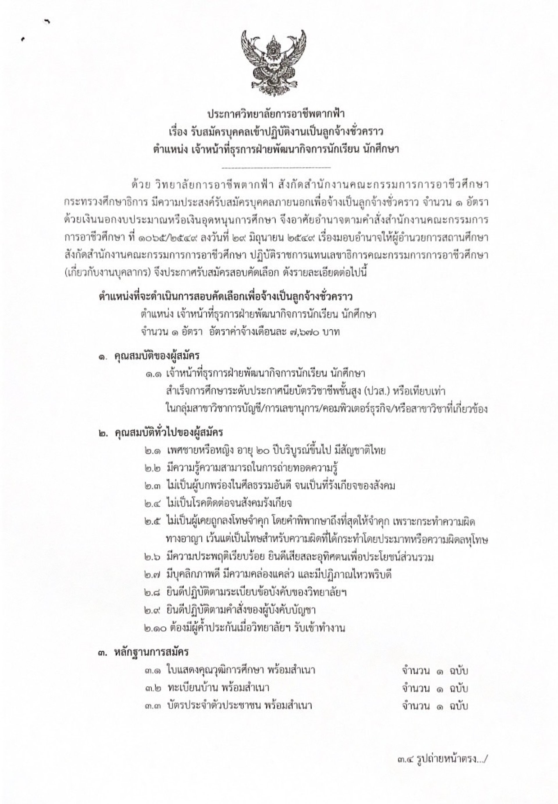 ประกาศวิทยาลัยการอาชีพตากฟ้า เรื่อง รับสมัครบุคคลเข้าปฏิบัติงานเป็นลูกจ้างชั่วคราว วิทยาลัยการอาชีพตากฟ้า มีความประสงค์รับสมัครบุคคลภายนอกเพื่อจ้างเป็นลูกจ้างชั่วคราว จำนวน ๑ อัตรา ๑. ตำแหน่ง เจ้าหน้าที่ธุรการฝ่ายพัฒนากิจการนักเรียน นักศึกษา จำนวน ๑ อัตรา