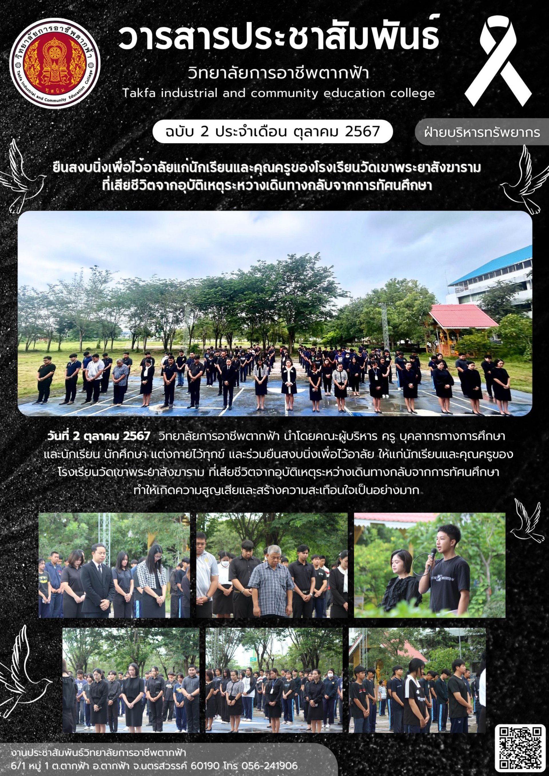 วารสารตากฟ้า ประจำเดือน ตุลาคม 2567 ฉบับที่ 2 ยืนสงบนิ่งเพื่อไว้อาลัยแก่นักเรียนและคุณครูของโรงเรียนวัดเขาพระยาสังฆารามที่เสียชีวิตจากอุบัติเหตุระหว่างเดินทางกลับจากการทัศนศึกษา