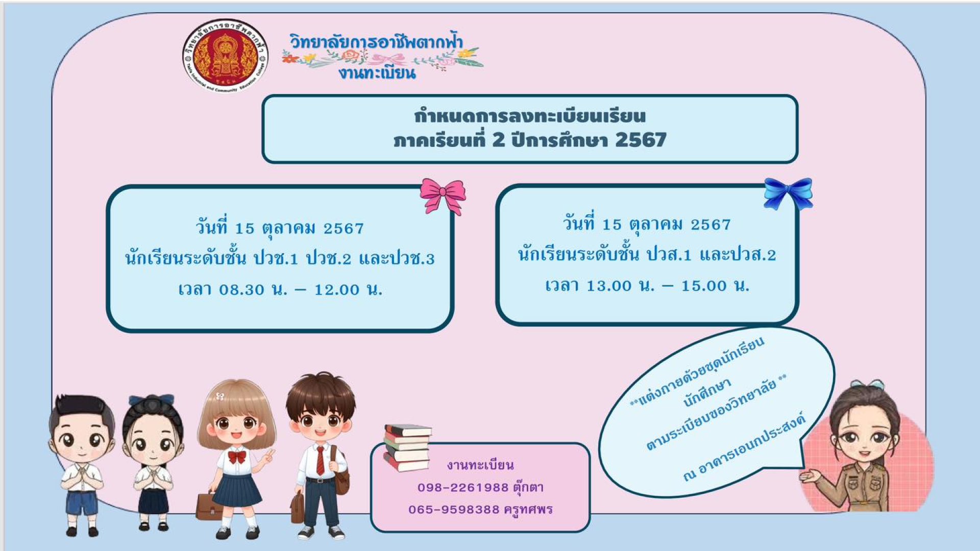 ประกาศวิทยาลัยการอาชีพตากฟ้า แจ้งกำหนดการลงทะเบียนเรียน ภาคเรียนที่ 2 ปีการศึกษา 2567 วันอังคาร ที่ 15 ตุลาคม 2567 ️ ปวช.1 ปวช.2 และปวช.3 เวลา 08.30 น. - 12.00 น. ️ ปวส.1 และปวส.2 เวลา 13.00 น. - 15.00 น. ณ อาคารอเนกประสงค์ วิทยาลัยการอาชีพตากฟ้า **แต