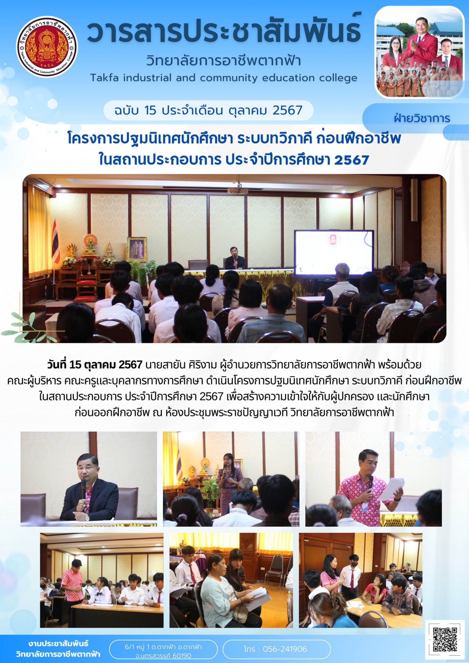วารสารตากฟ้า ประจำเดือน ตุลาคม 2567 ฉบับที่ 15 โครงการปฐมนิเทศนักศึกษา ระบบทวิภาคี ก่อนฝึกอาชีพในสถานประกอบการ ประจำปีการศึกษา 2567