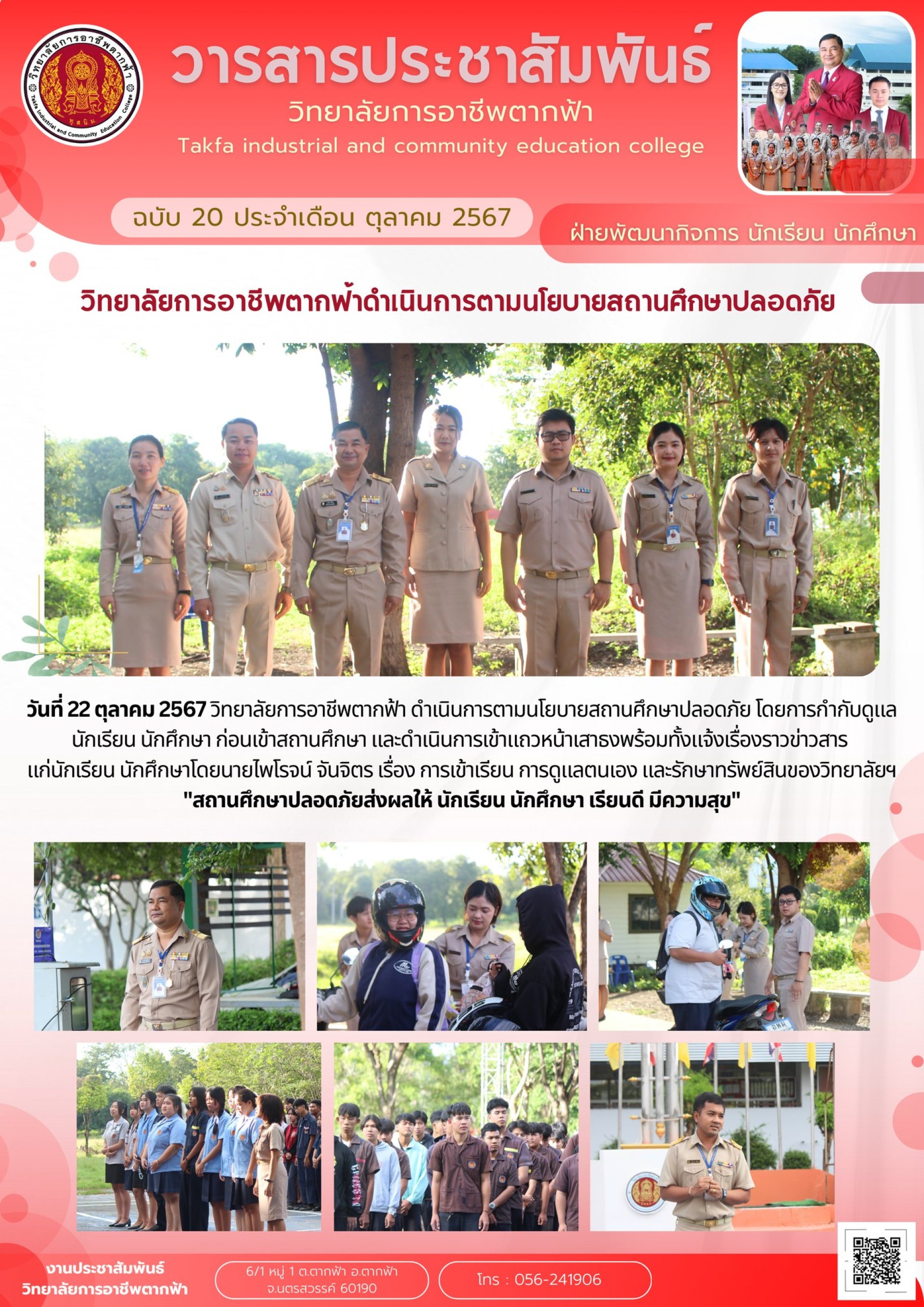 วารสารตากฟ้า ประจำเดือน ตุลาคม 2567 ฉบับที่ 20 วิทยาลัยการอาชีพตากฟ้าดำเนินการตามนโยบายสถานศึกษาปลอดภัย