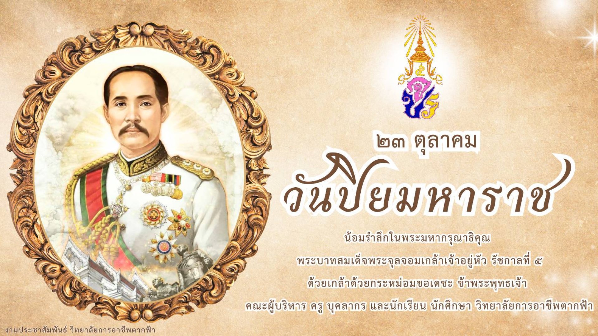 เนื่องในวันคล้ายวันสวรรคตของพระบาทสมเด็จพระจุลจอมเกล้าเจ้าอยู่หัว รัชกาลที่ ๕ "วันปิยมหาราช" วันที่ ๒๓ ตุลาคม ๒๕๖๗ น้อมรำลึกในพระมหากรุณาธิคุณ ด้วยเกล้าด้วยกระหม่อมขอเดชะ ข้าพระพุทธเจ้า คณะผู้บริหาร ครู บุคลากร และนักเรียน นักศึกษา วิทยาลัยกา