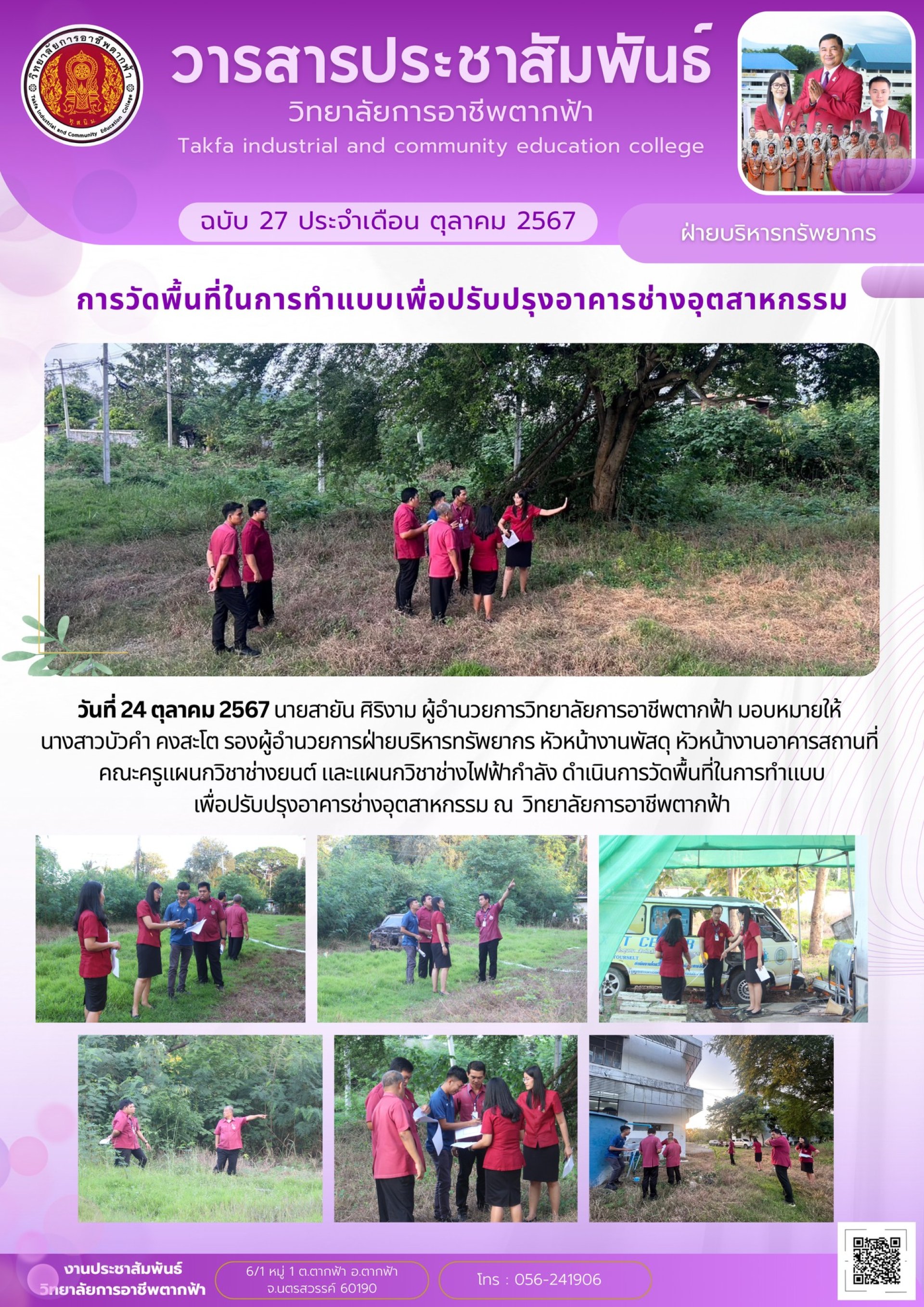 วันที่ 24 ตุลาคม 2567 นายสายัน ศิริงาม ผู้อำนวยการวิทยาลัยการอาชีพตากฟ้า มอบหมายให้ นางสาวบัวคำ คงสะโต รองผู้อำนวยการฝ่ายบริหารทรัพยากร หัวหน้างานพัสดุ หัวหน้างานอาคารสถานที่ คณะครูแผนกวิชาช่างยนต์ และแผนกวิชาช่างไฟฟ้ากำลัง ดำเนินการวัดพื้นที่ในการทำแบบเพื่อปรับปรุงอาคารช่างอุตสาหกรรม ณ วิทยาลัยการอาชีพตากฟ้า