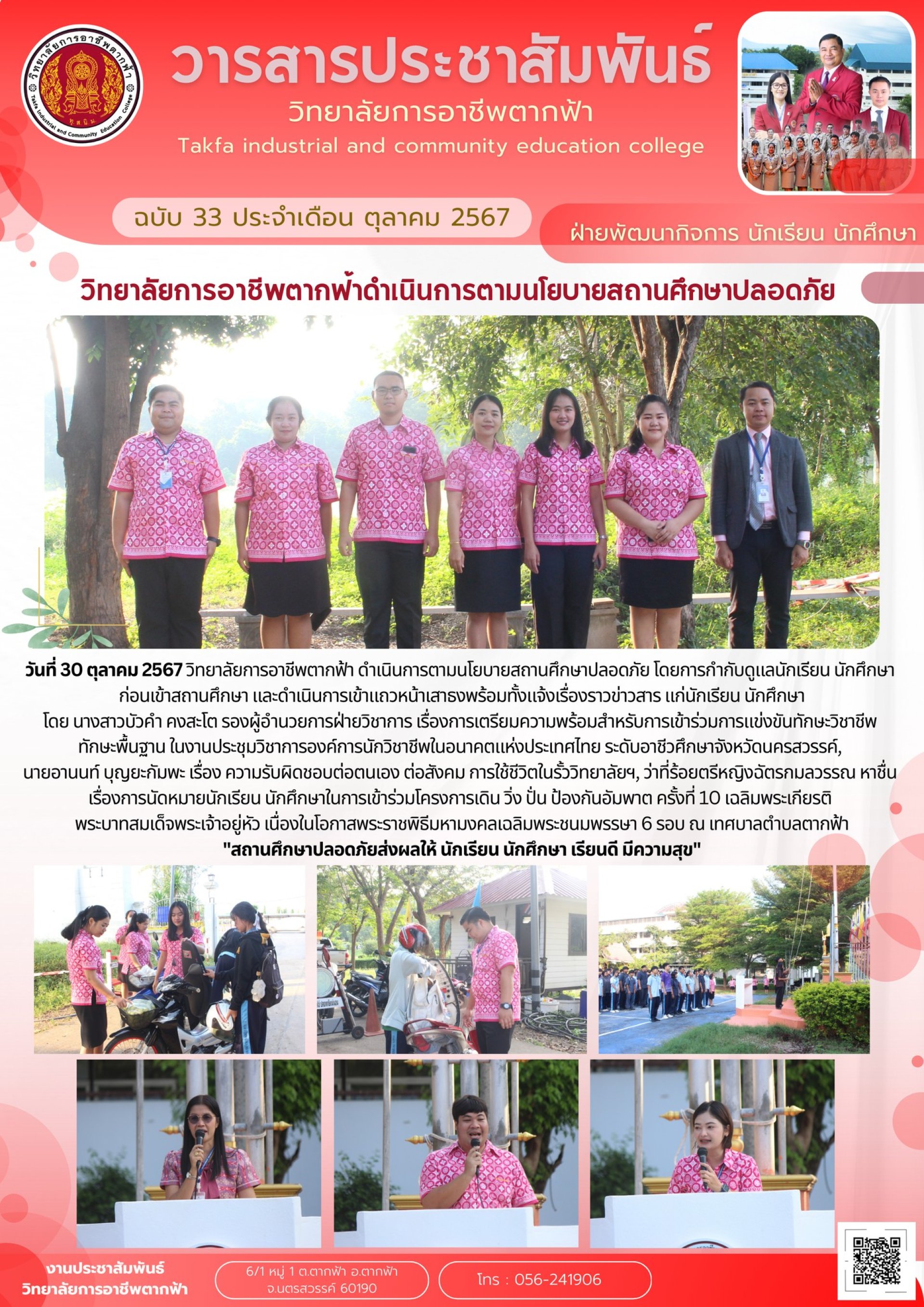 วารสารตากฟ้า ประจำเดือน ตุลาคม 2567 ฉบับที่ 33 วิทยาลัยการอาชีพตากฟ้าดำเนินการตามนโยบายสถานศึกษาปลอดภัย