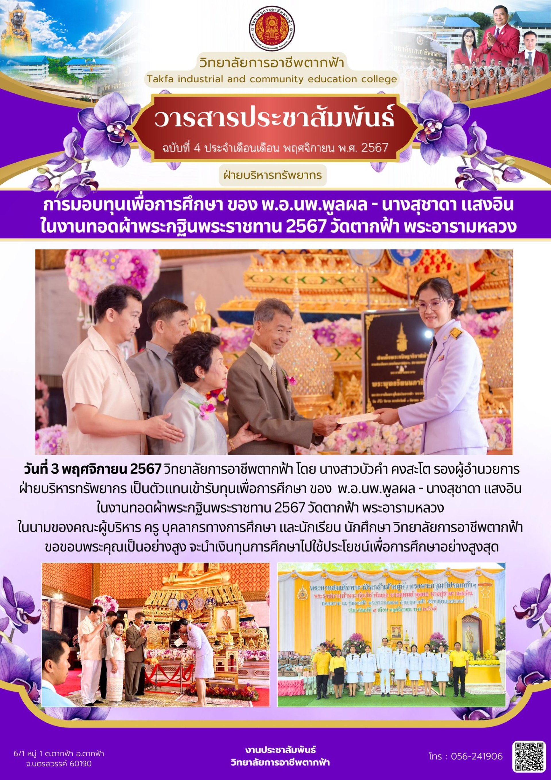 วารสารตากฟ้า ประจำเดือน พฤศจิกายน 2567 ฉบับที่ 4 การมอบทุนเพื่อการศึกษา ของ พ.อ.นพ.พูลผล - นางสุชาดา แสงอิน ในงานทอดผ้าพระกฐินพระราชทาน 2567 วัดตากฟ้า พระอารามหลวง