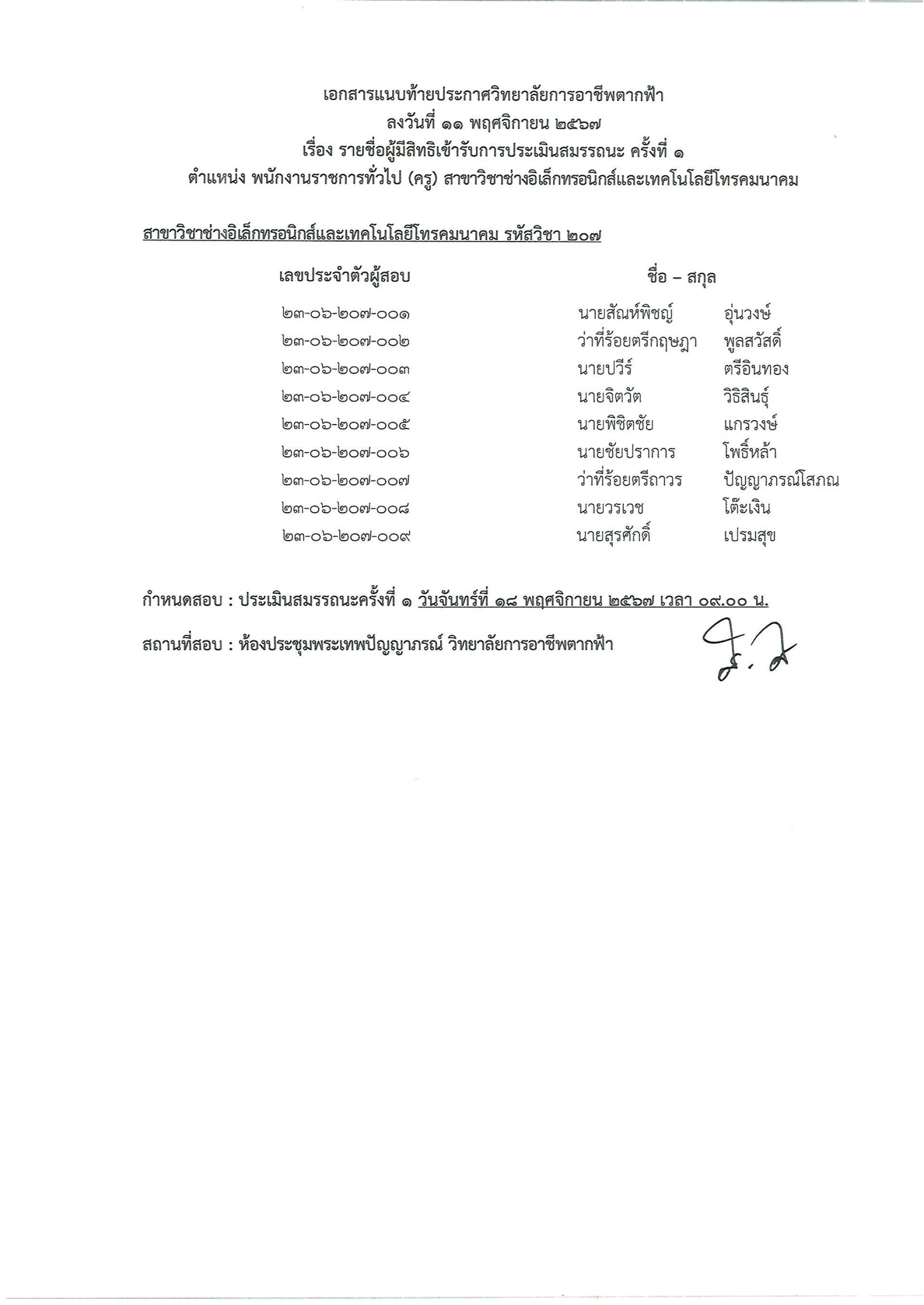 ประกาศวิทยาลัยการอาชีพตากฟ้า เรื่อง รายชื่อผู้มีสิทธิเข้ารับการประเมินสมรรถนะ ครั้งที่ 1 และกำหนดวัน เวลา สถานที่ในการประเมินสมรรถนะ ตามที่ได้มีประกาศวิทยาลัยการอาชีพตากฟ้า ลงวันที่ 17 ตุลาคม 2567 เรื่อง รับสมัครบุคคลเพื่อเลือกสรรเป็นพนักงานราชการ ตำแหน่ง