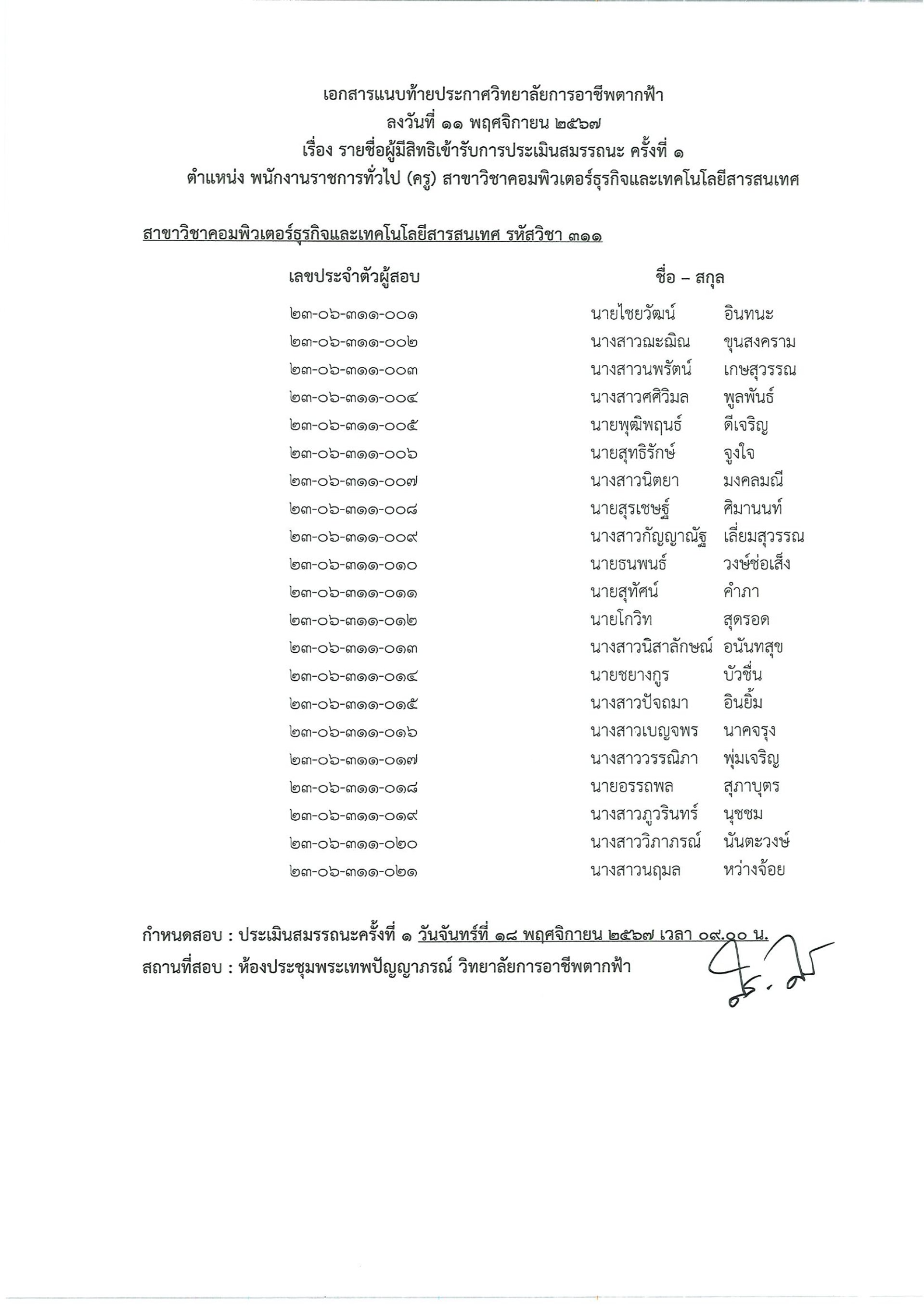 ประกาศวิทยาลัยการอาชีพตากฟ้า เรื่อง รายชื่อผู้มีสิทธิเข้ารับการประเมินสมรรถนะ ครั้งที่ 1 และกำหนดวัน เวลา สถานที่ในการประเมินสมรรถนะ ตามที่ได้มีประกาศวิทยาลัยการอาชีพตากฟ้า ลงวันที่ 17 ตุลาคม 2567 เรื่อง รับสมัครบุคคลเพื่อเลือกสรรเป็นพนักงานราชการ ตำแหน่ง
