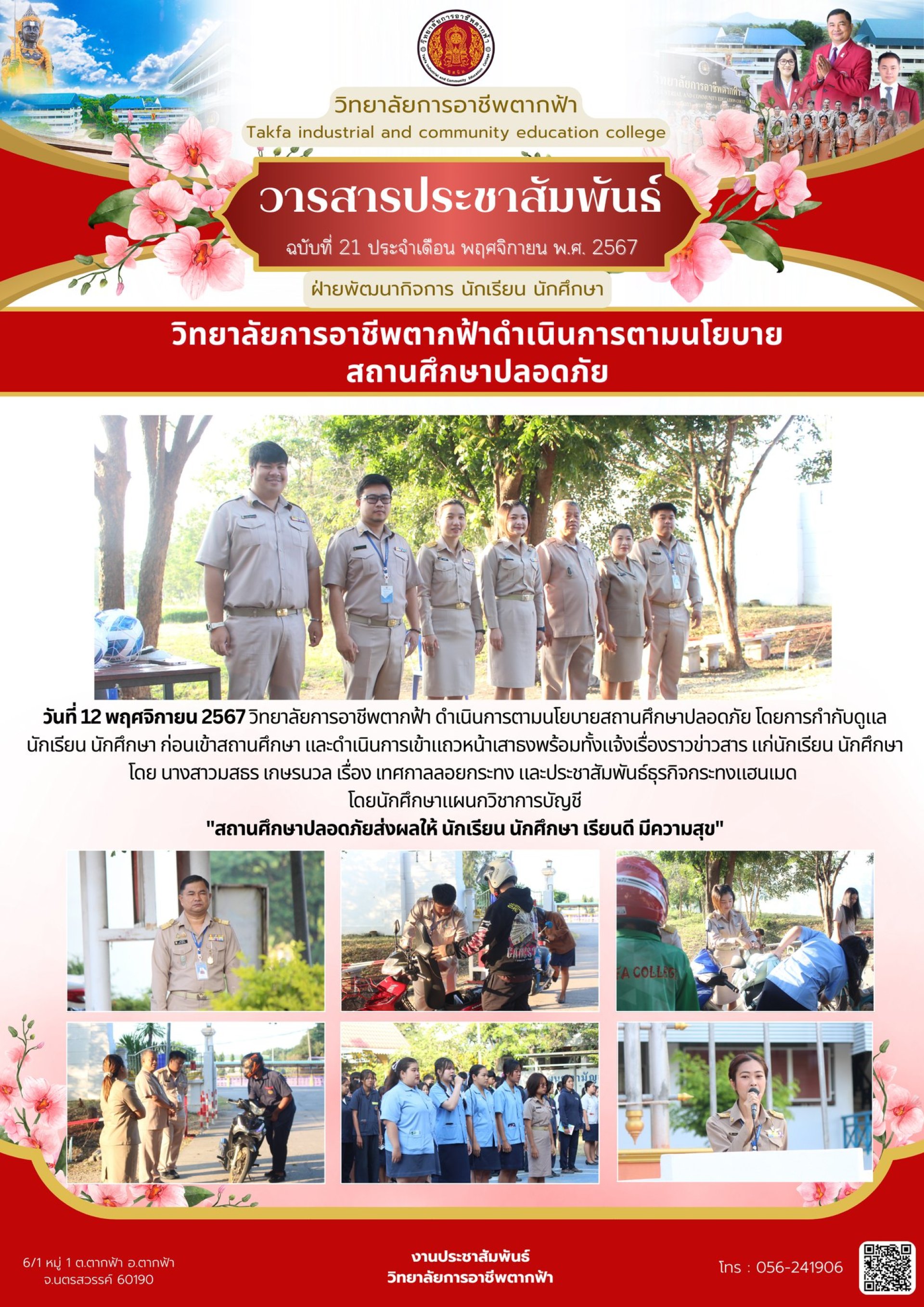 วารสารตากฟ้า ประจำเดือน พฤศจิกายน 2567 ฉบับที่ 21 วิทยาลัยการอาชีพตากฟ้าดำเนินการตามนโยบายสถานศึกษาปลอดภัย